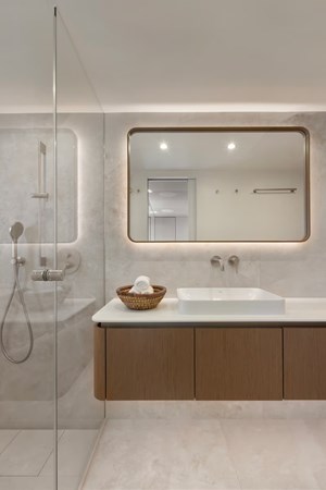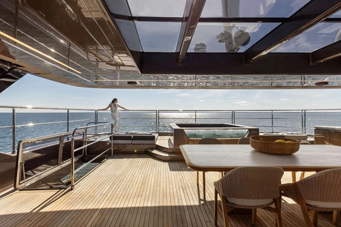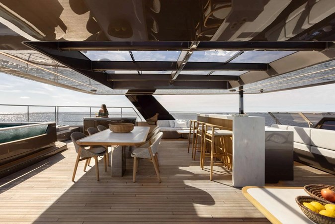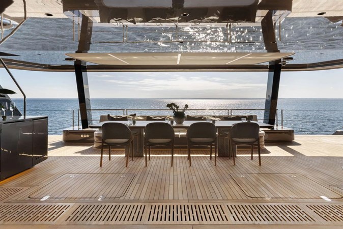 Built for long-range, stable cruising, TWILIGHT offers spacious and thoughtfully designed interiors, including a bright full-beam salon and a principal cabin with private access to the bow terrace. Accommodating up to ten guests in five cabins, TWILIGHT provides plenty of space to relax. The expansive flybridge features a jacuzzi, bar, and barbecue, while the impressive beach club creates a seamless connection to the water. With a Highfield tender, jetskis, a Seabob, and a Fliteboard included, TWILIGHT is perfectly set up for adventure and leisure.