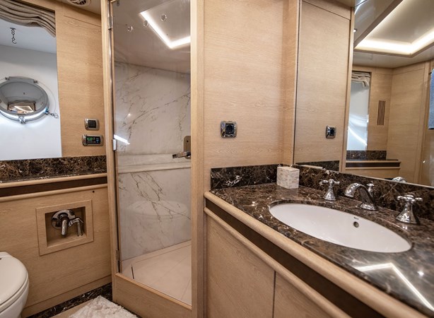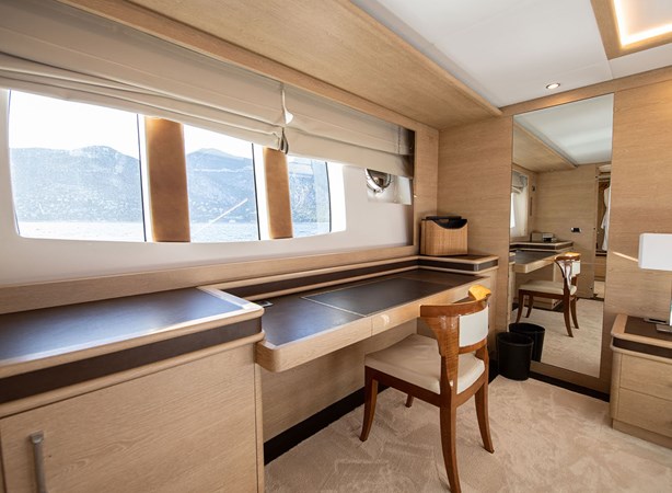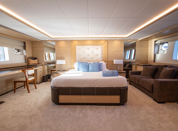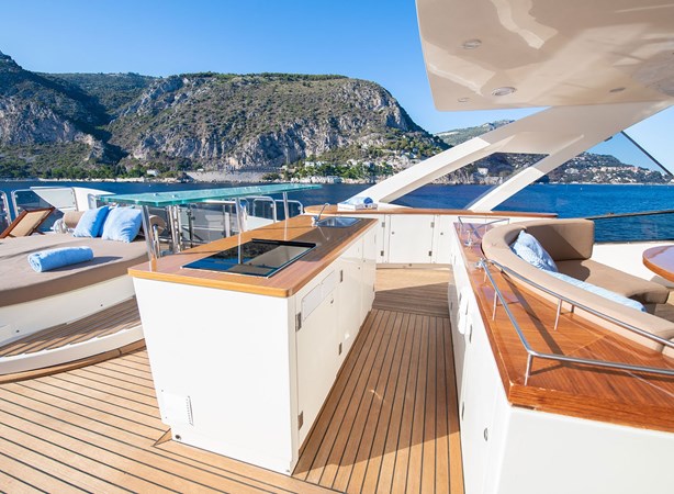 On deck, the expansive flybridge is a highlight of the yacht, featuring generous sunbathing areas, a dining space, several seating areas and a full wet-bar making it the perfect setting for relaxation and entertainment.