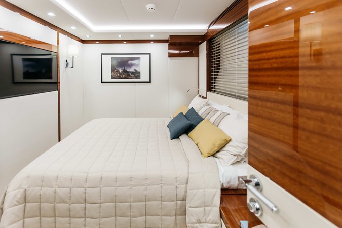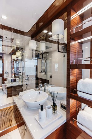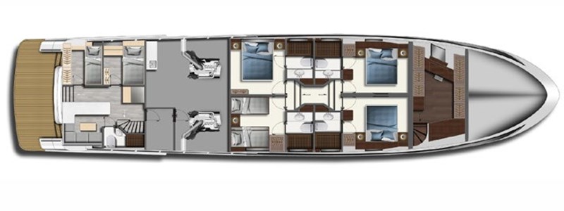 The yacht is equipped with two stabilization systems—gyroscopic and hydraulic—that work together to reduce motion in various sea conditions, enhancing comfort during long passages.