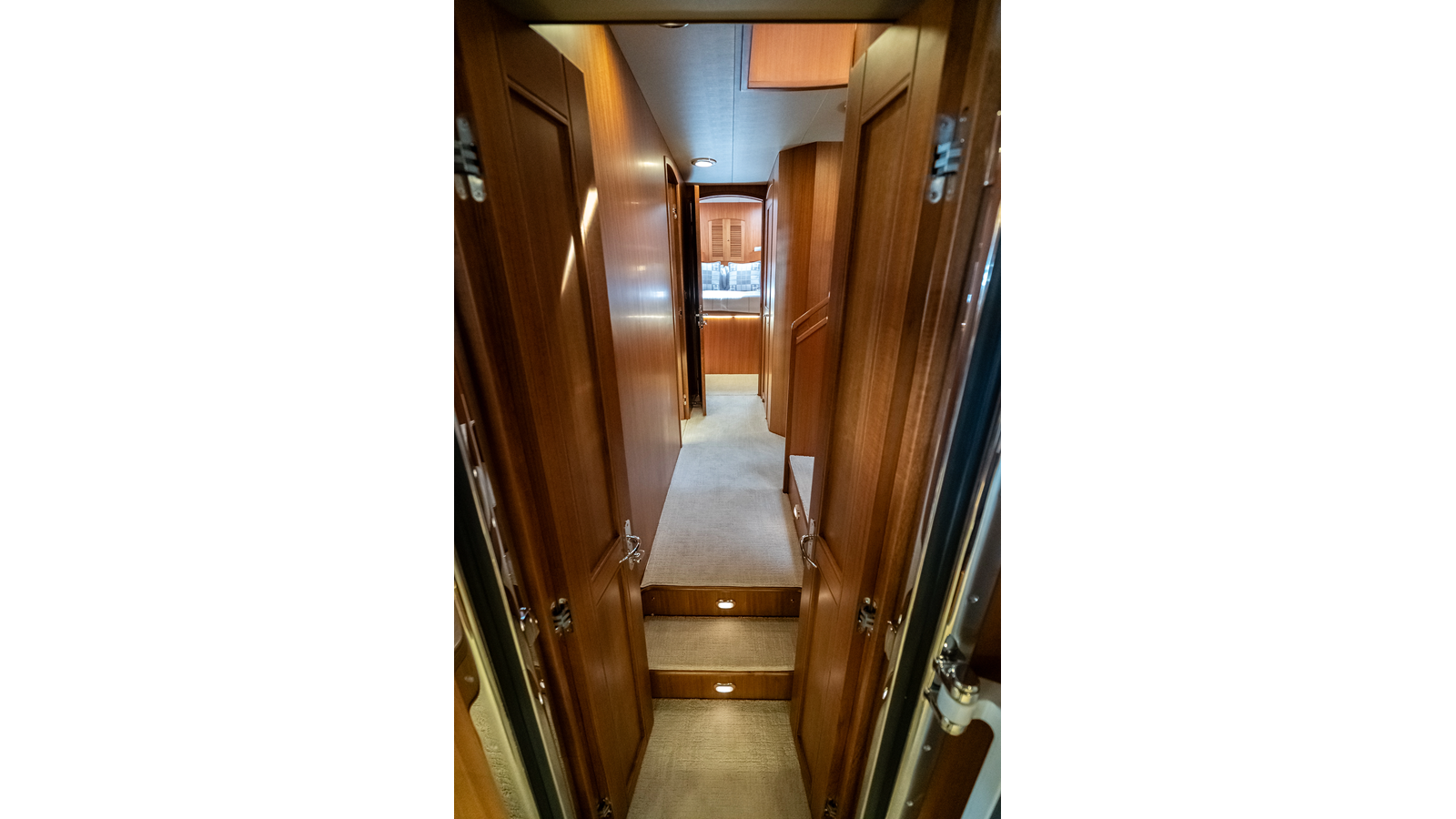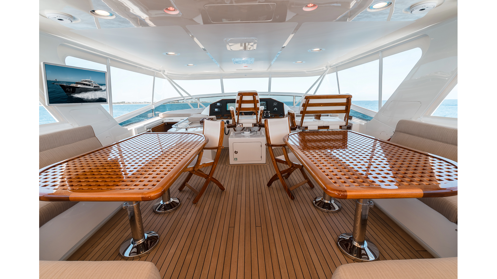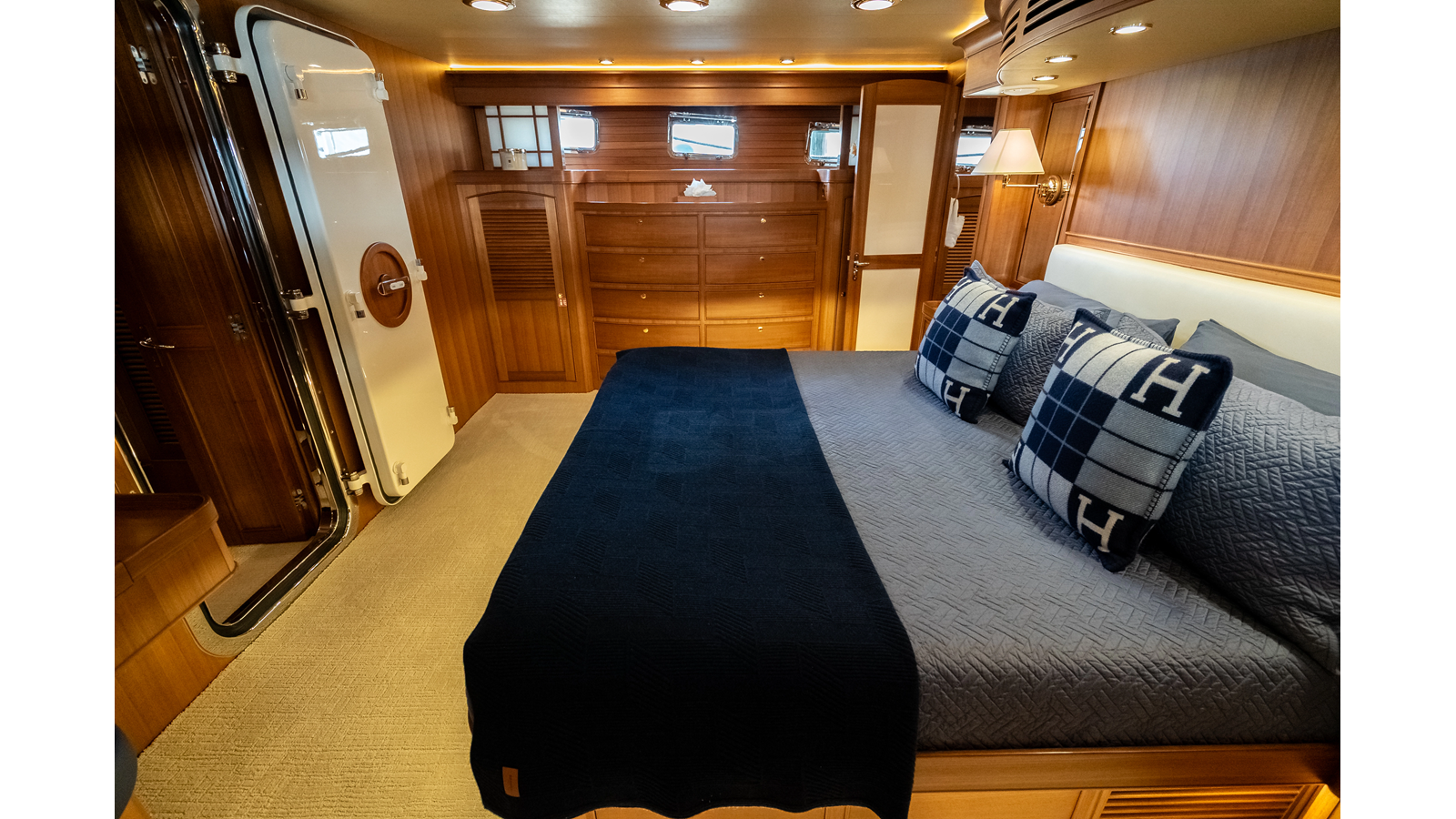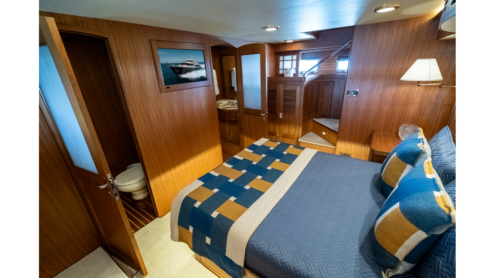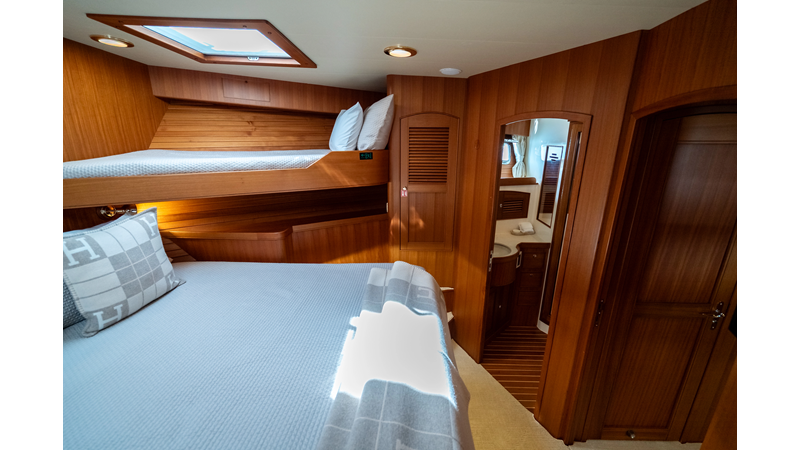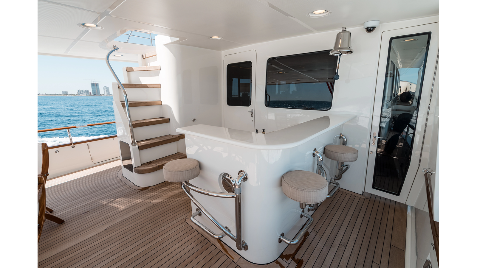 She has both the preferred open flybridge arrangement with upper and lower helms as well as the 4 cabin layout with two full-beam staterooms.The fully serviced CAT C32s provide a 20-knot cruise and top speed of 25 knots.