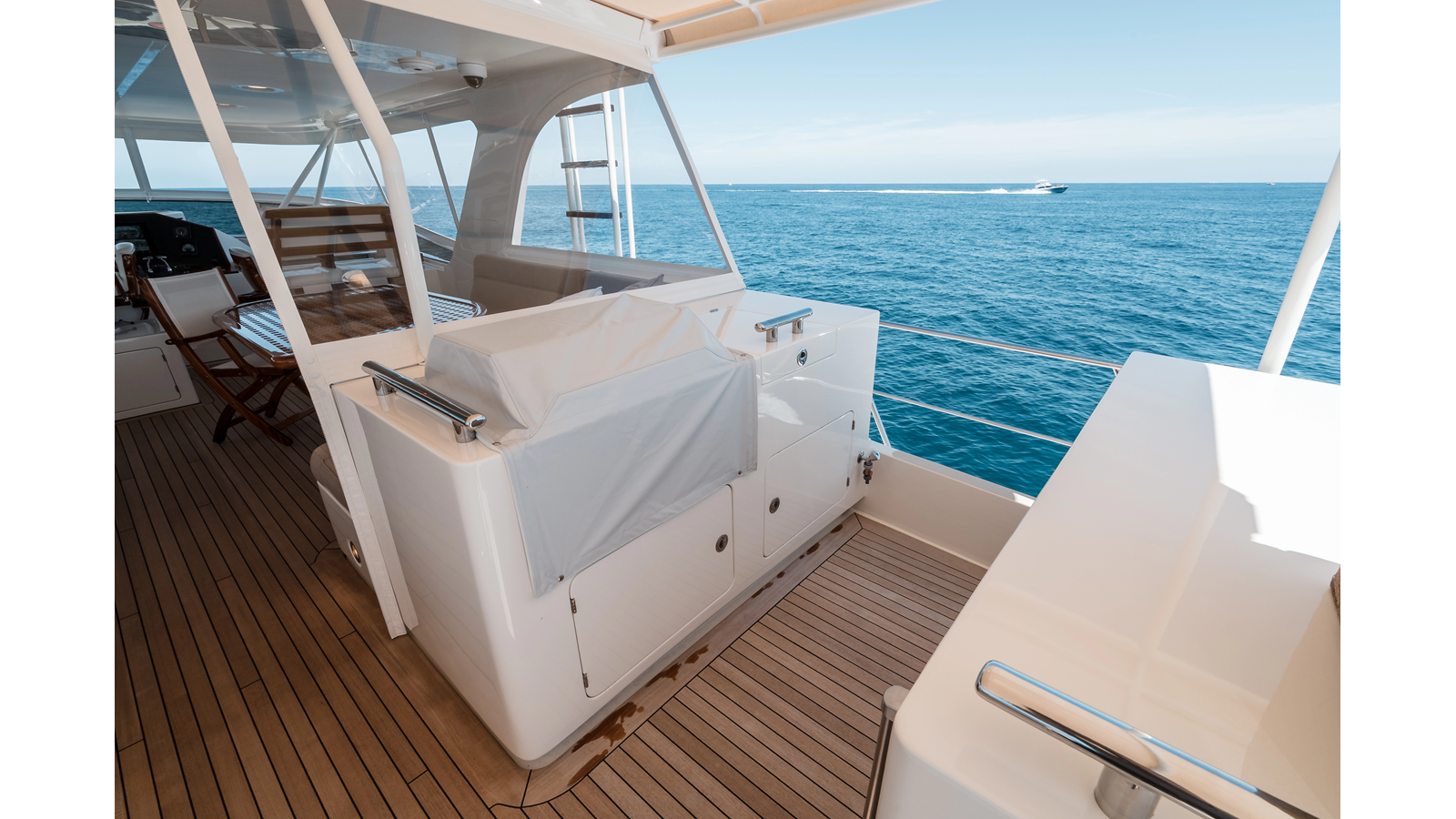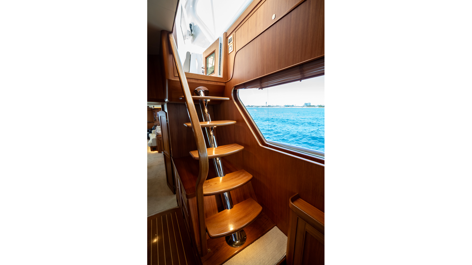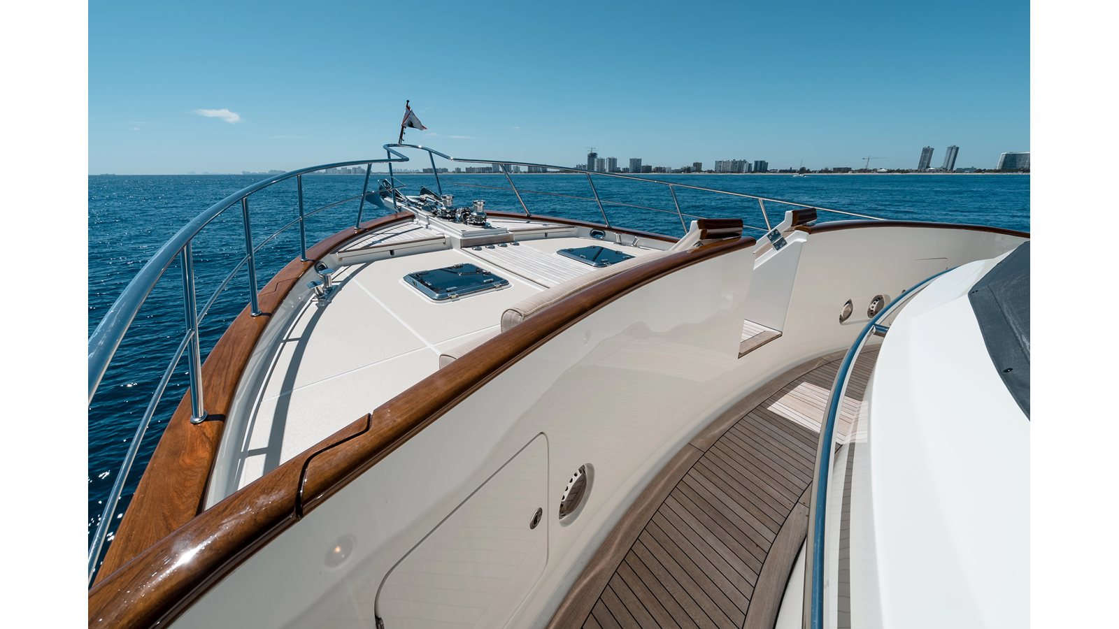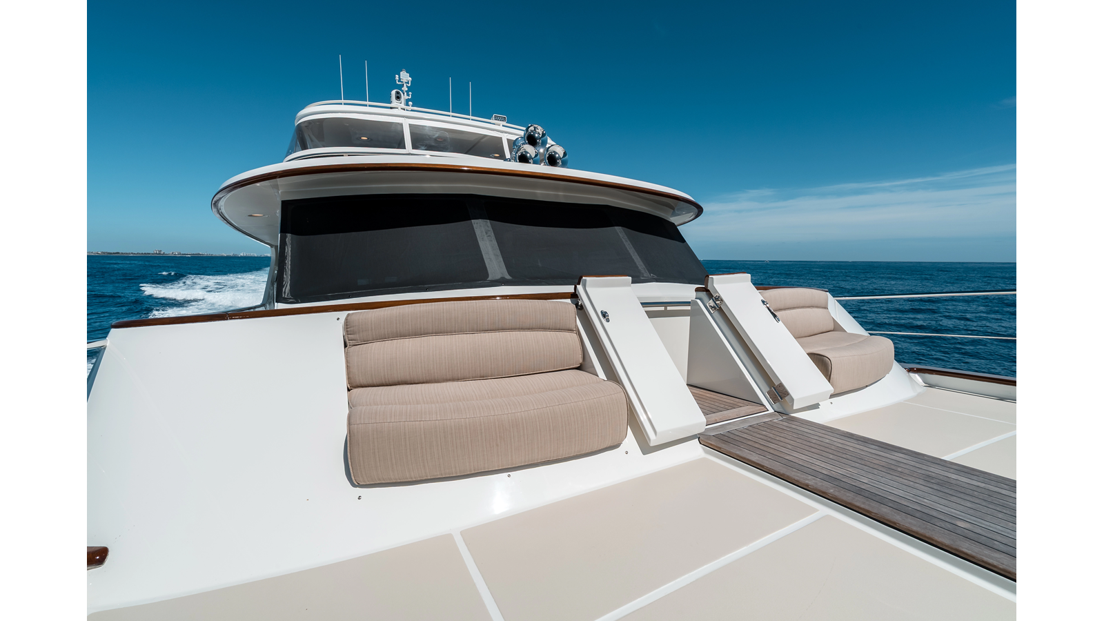 She has both the preferred open flybridge arrangement with upper and lower helms as well as the 4 cabin layout with two full-beam staterooms.The fully serviced CAT C32s provide a 20-knot cruise and top speed of 25 knots.