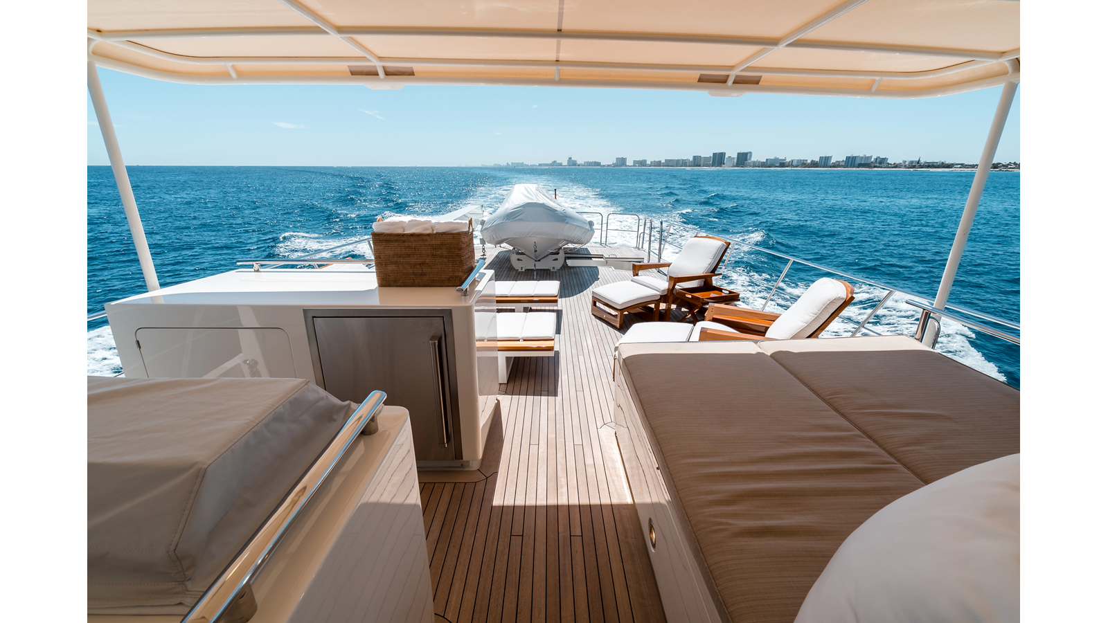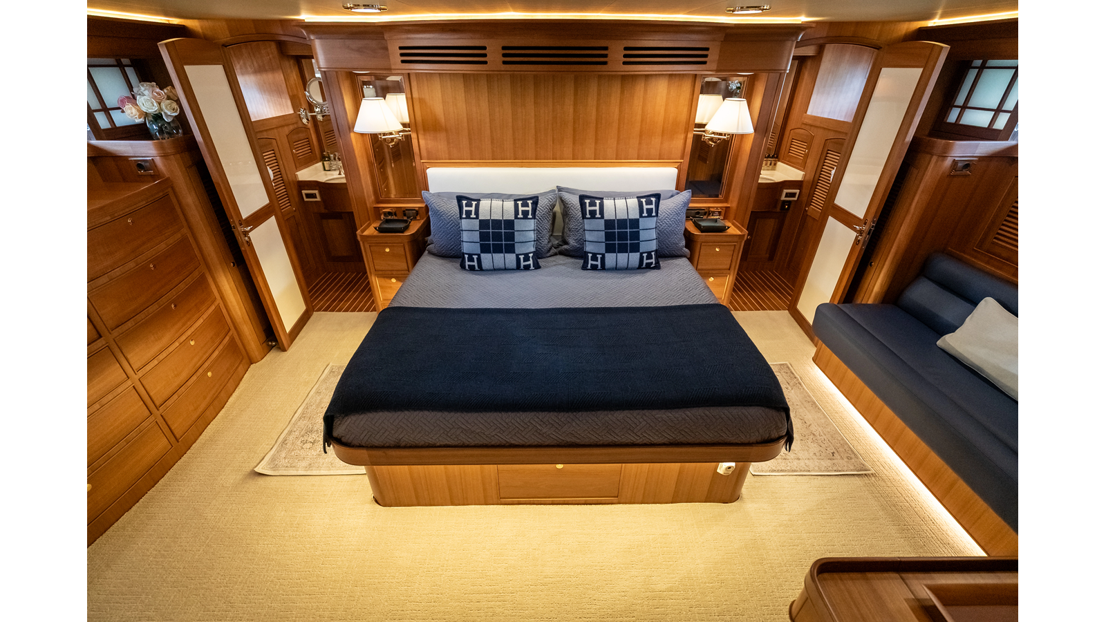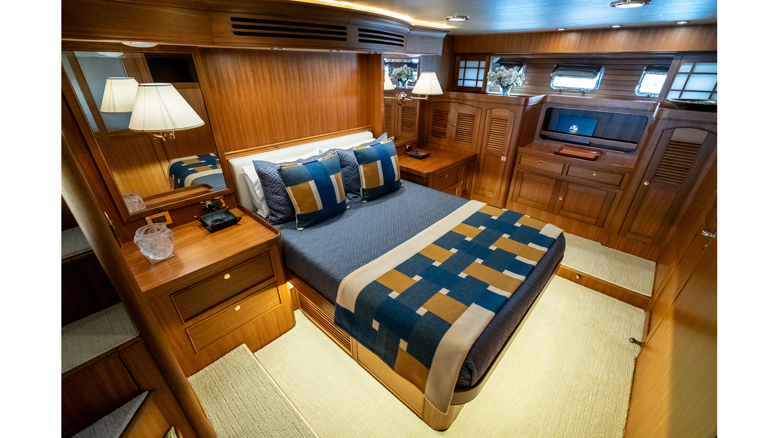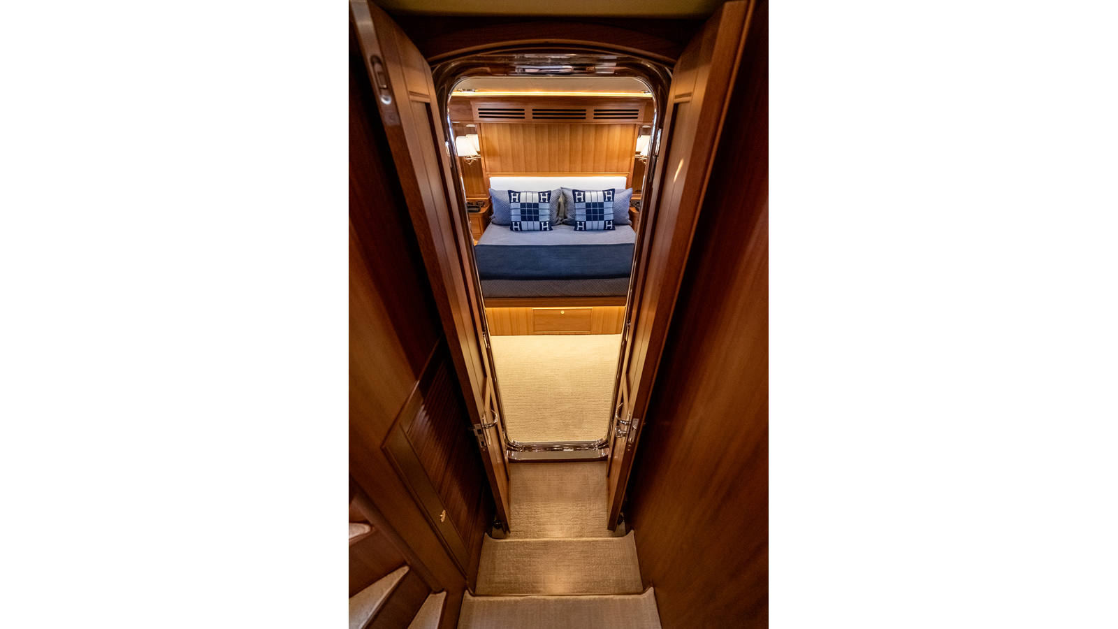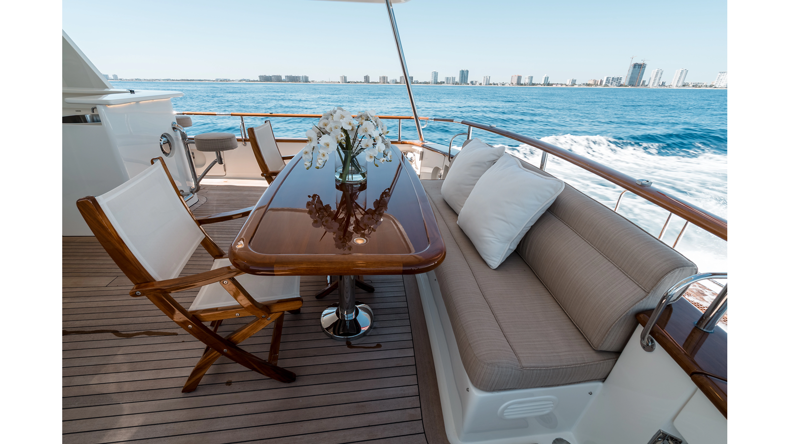 She has both the preferred open flybridge arrangement with upper and lower helms as well as the 4 cabin layout with two full-beam staterooms.The fully serviced CAT C32s provide a 20-knot cruise and top speed of 25 knots.