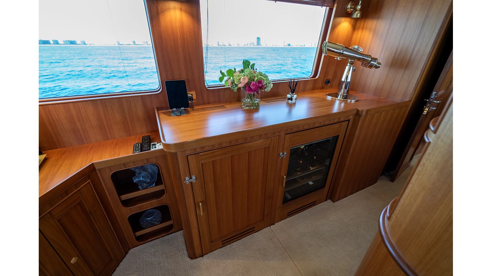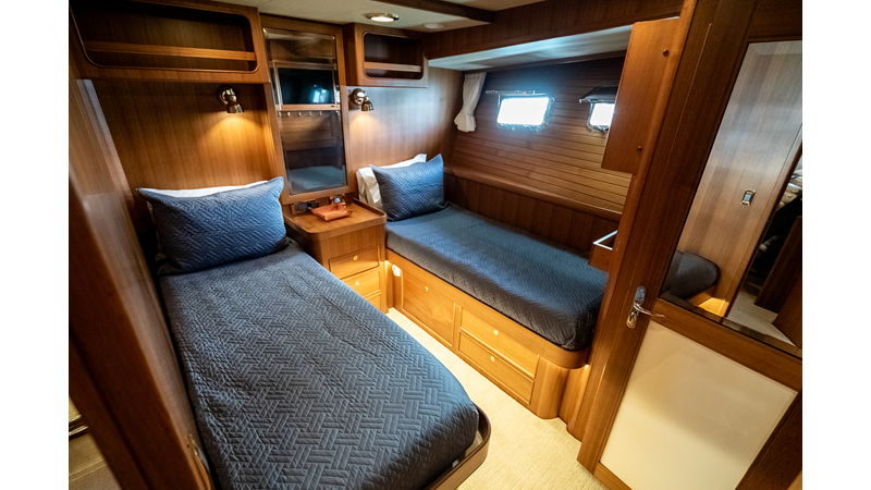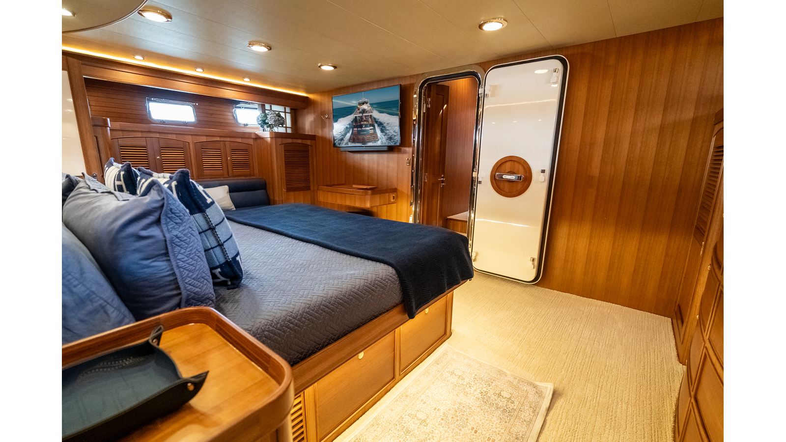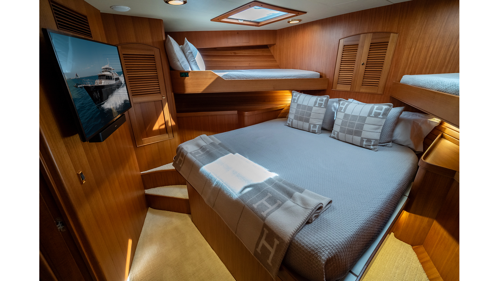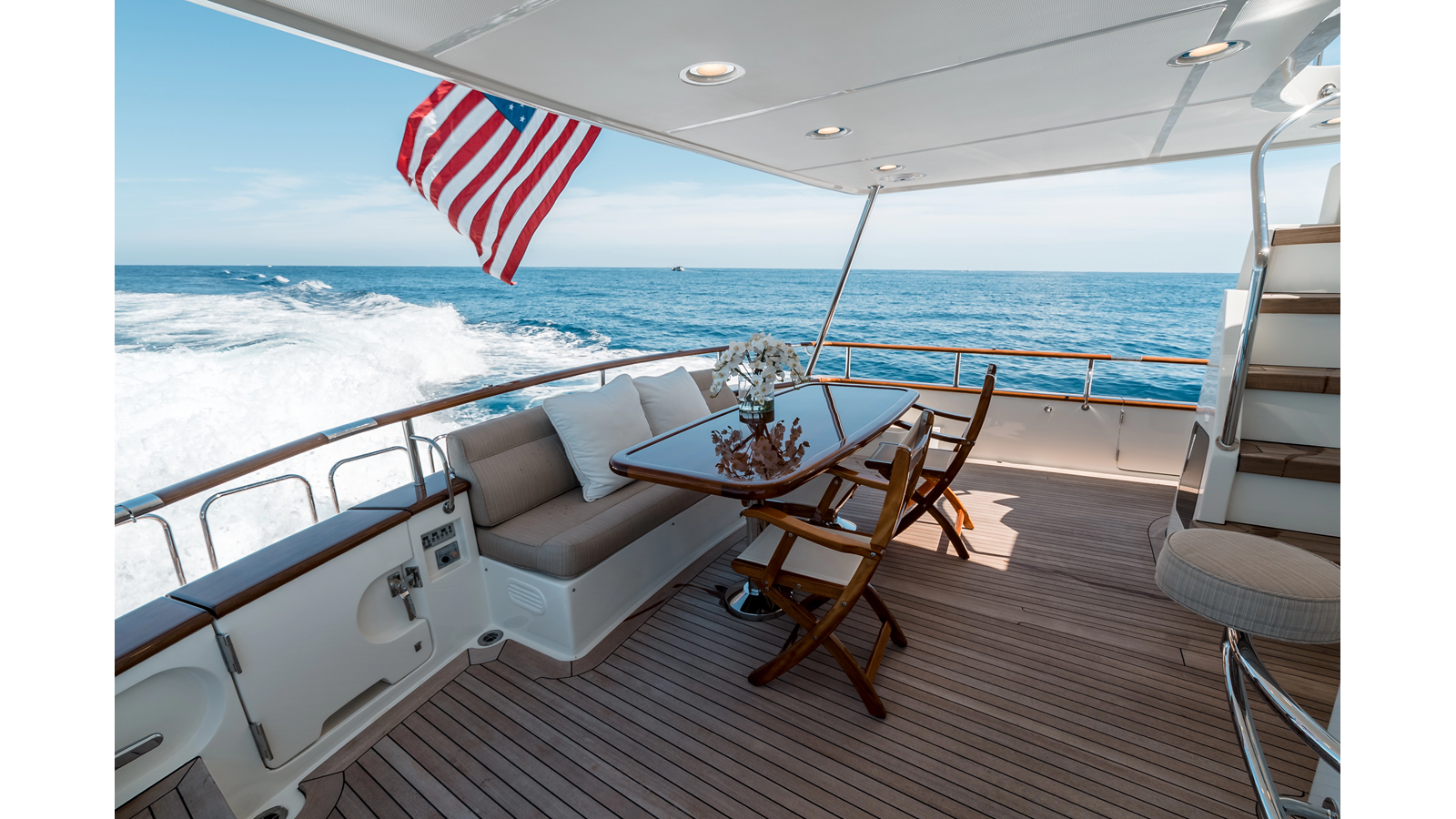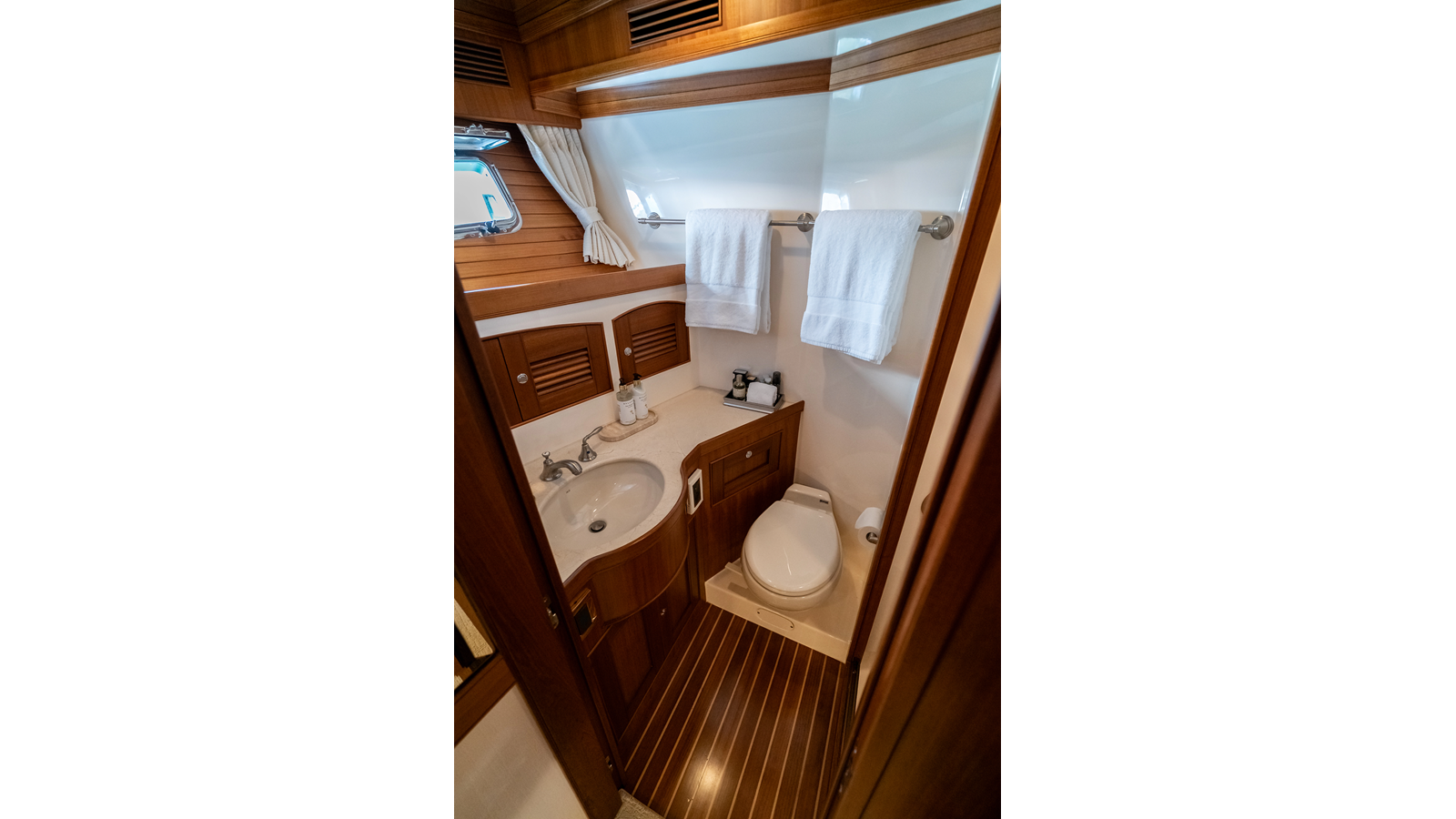 She has both the preferred open flybridge arrangement with upper and lower helms as well as the 4 cabin layout with two full-beam staterooms.The fully serviced CAT C32s provide a 20-knot cruise and top speed of 25 knots.