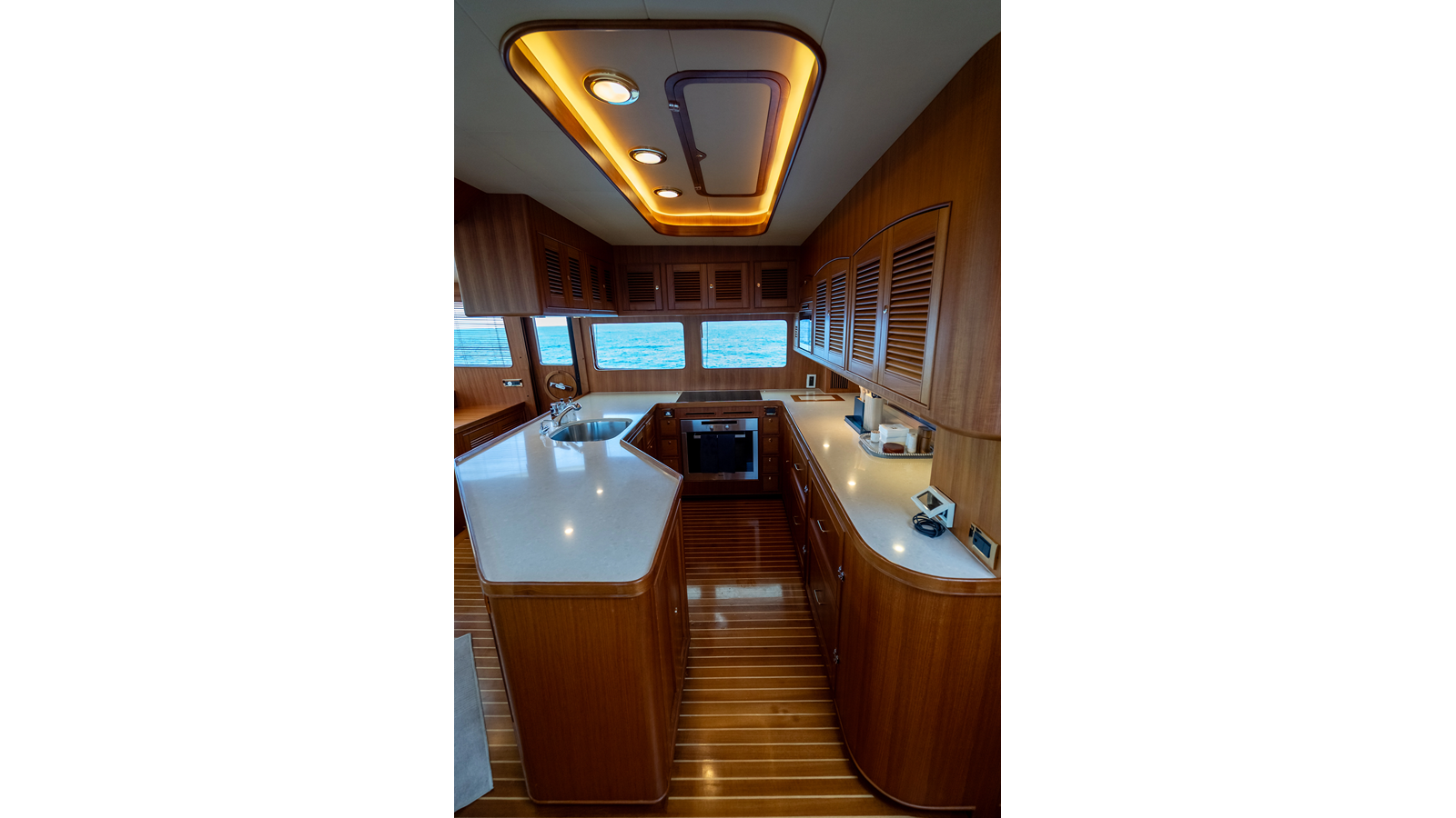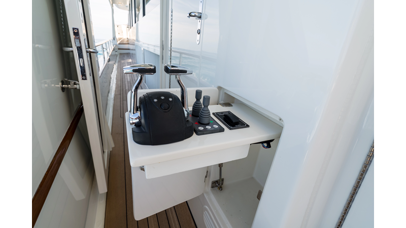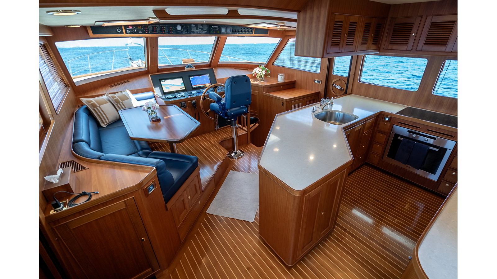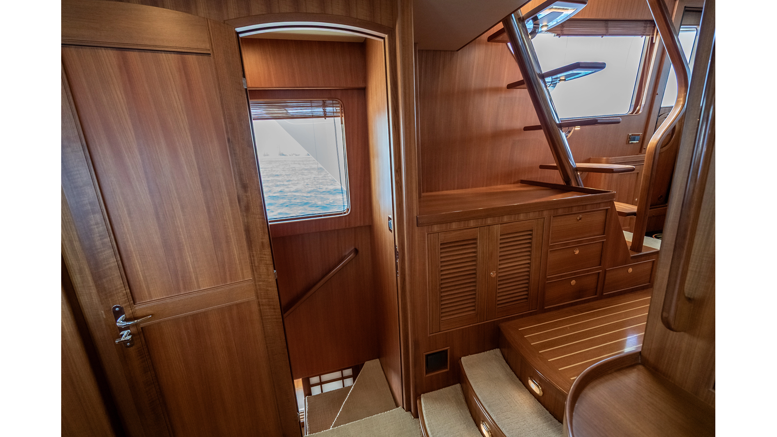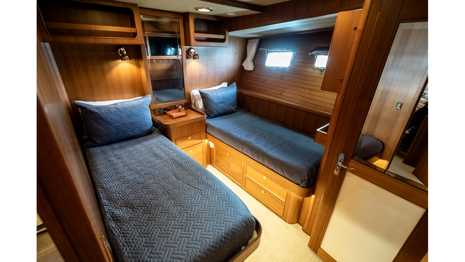 She has both the preferred open flybridge arrangement with upper and lower helms as well as the 4 cabin layout with two full-beam staterooms.The fully serviced CAT C32s provide a 20-knot cruise and top speed of 25 knots.