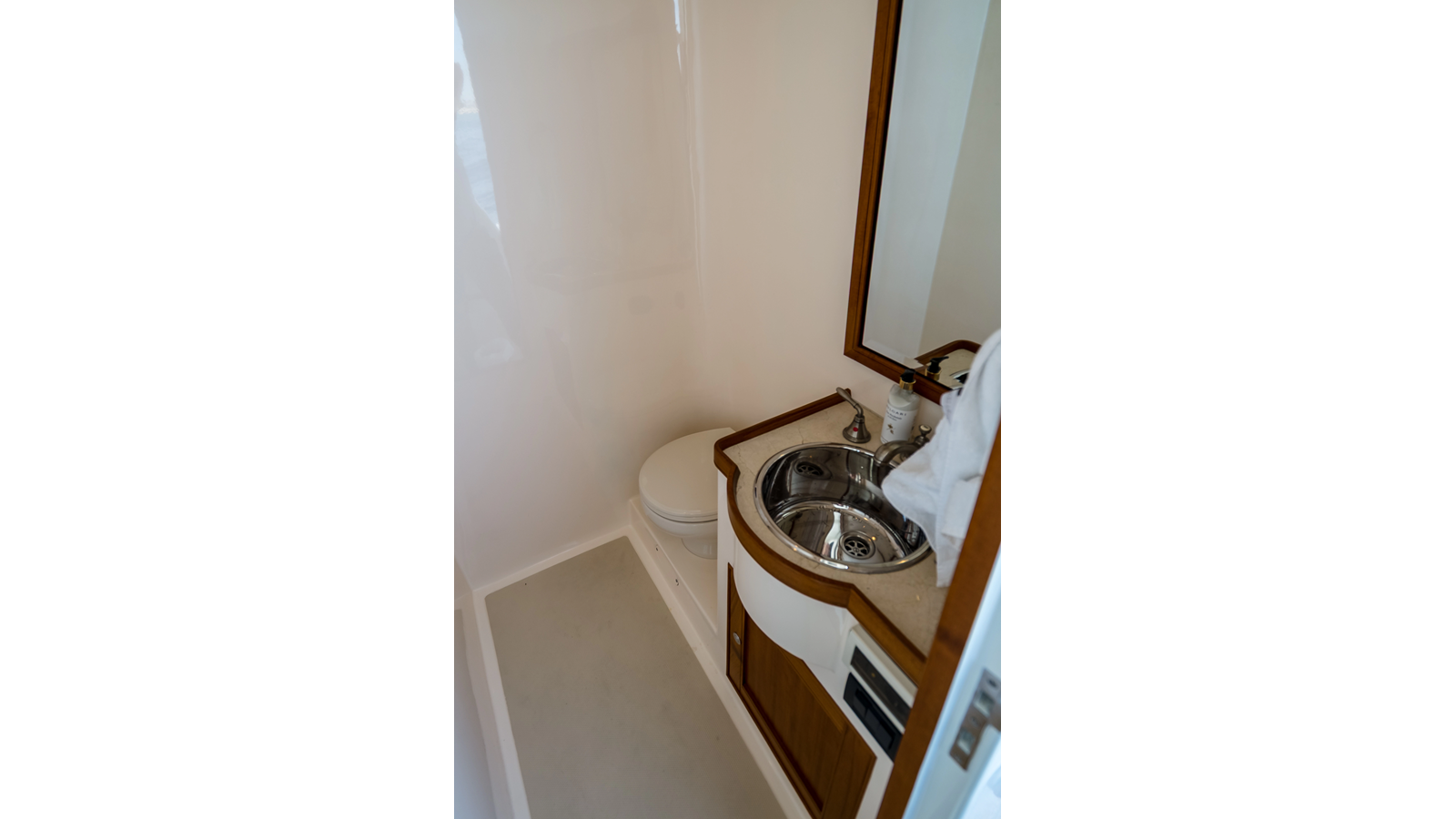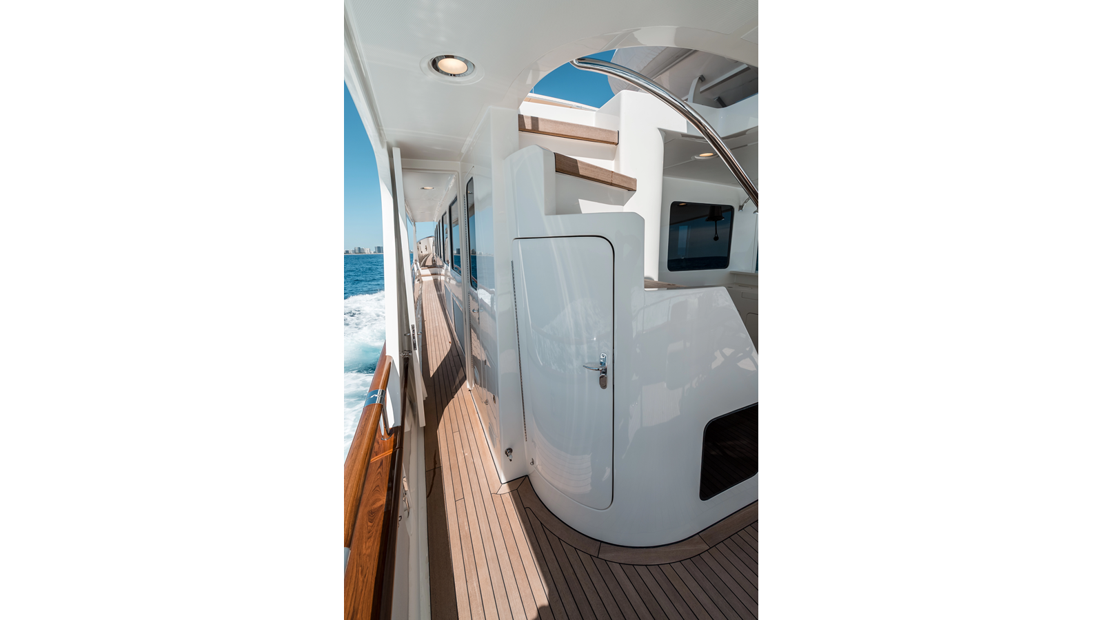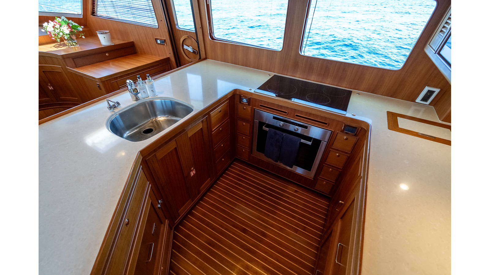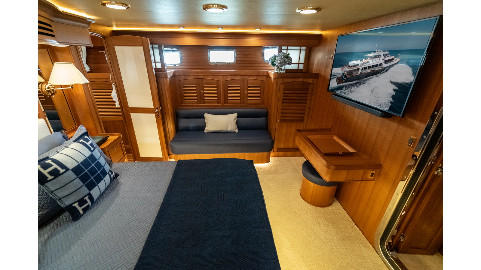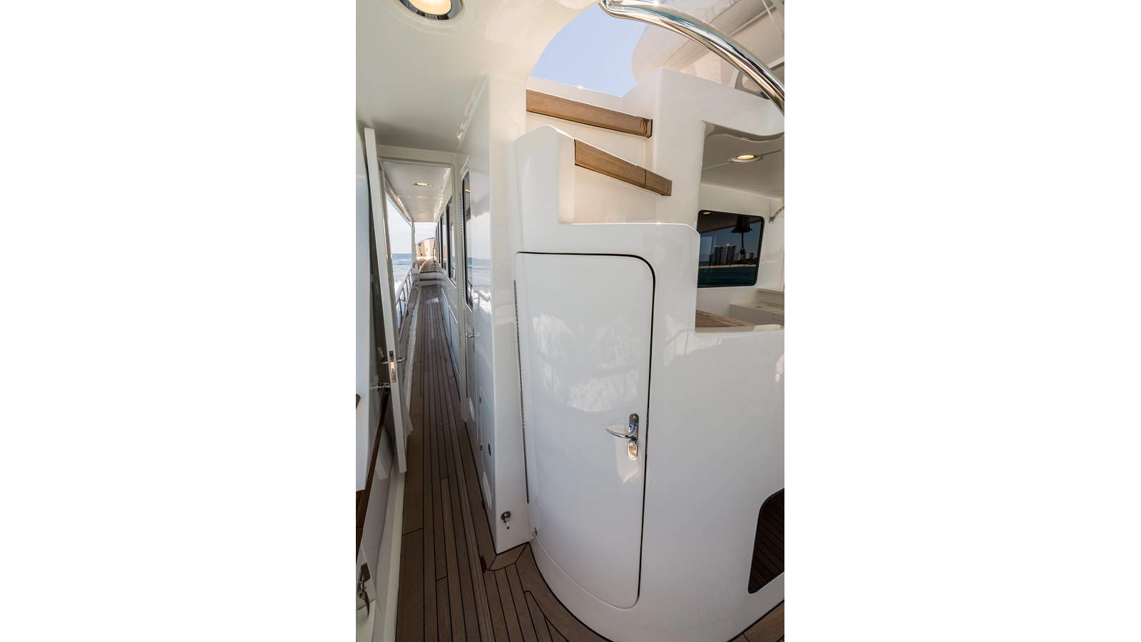 She has both the preferred open flybridge arrangement with upper and lower helms as well as the 4 cabin layout with two full-beam staterooms.The fully serviced CAT C32s provide a 20-knot cruise and top speed of 25 knots.