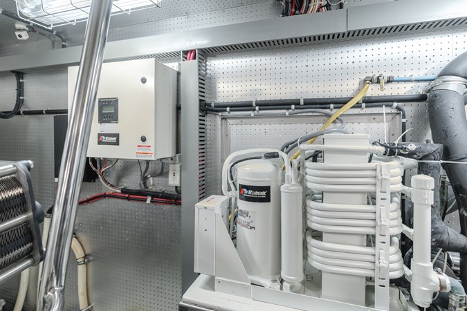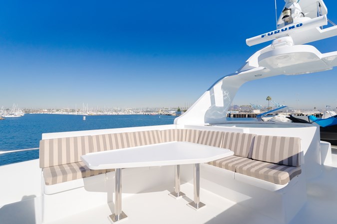 The 2003 97′ Transworld Yacht boasts a spacious and elegantly designed deck, providing panoramic views of the waters that stretch beyond the horizon. The place to be is undoubtedly the onboard hot tub, strategically positioned to offer an unrivaled experience of relaxation while surrounded by the beauty of the open ocean.
