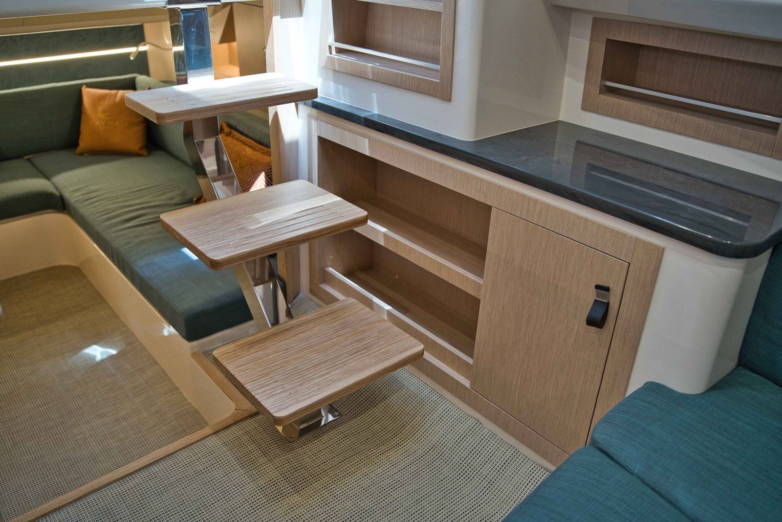 Powered by inboard engines, the Cayman 380WA delivers impressive performance with a cruising speed of 25 knots and a top speed of 35 knots. This ensures swift and efficient travel, whether you’re exploring coastal waters or heading to your favorite anchorage. With a fuel capacity of 800 liters, the yacht also offers a generous range for extended journeys.