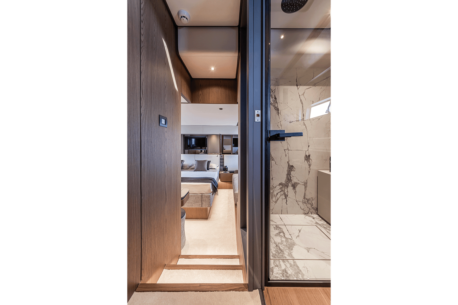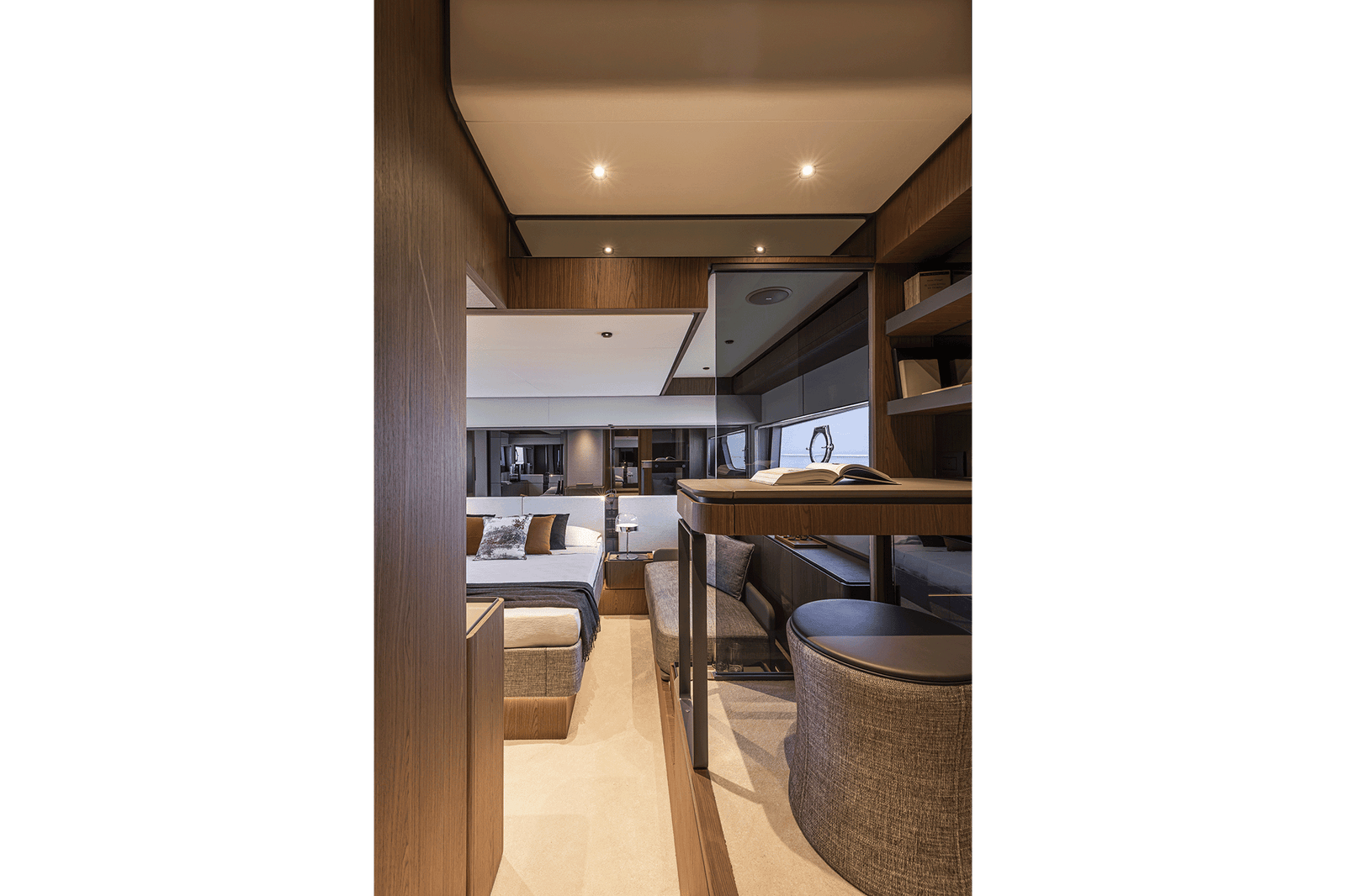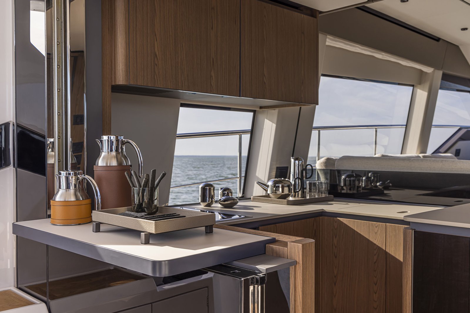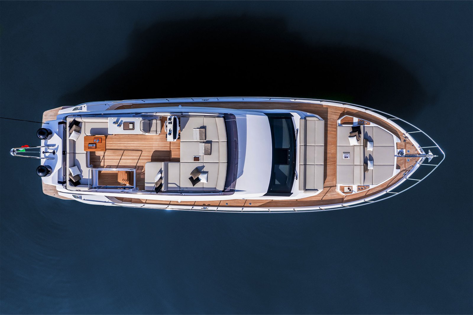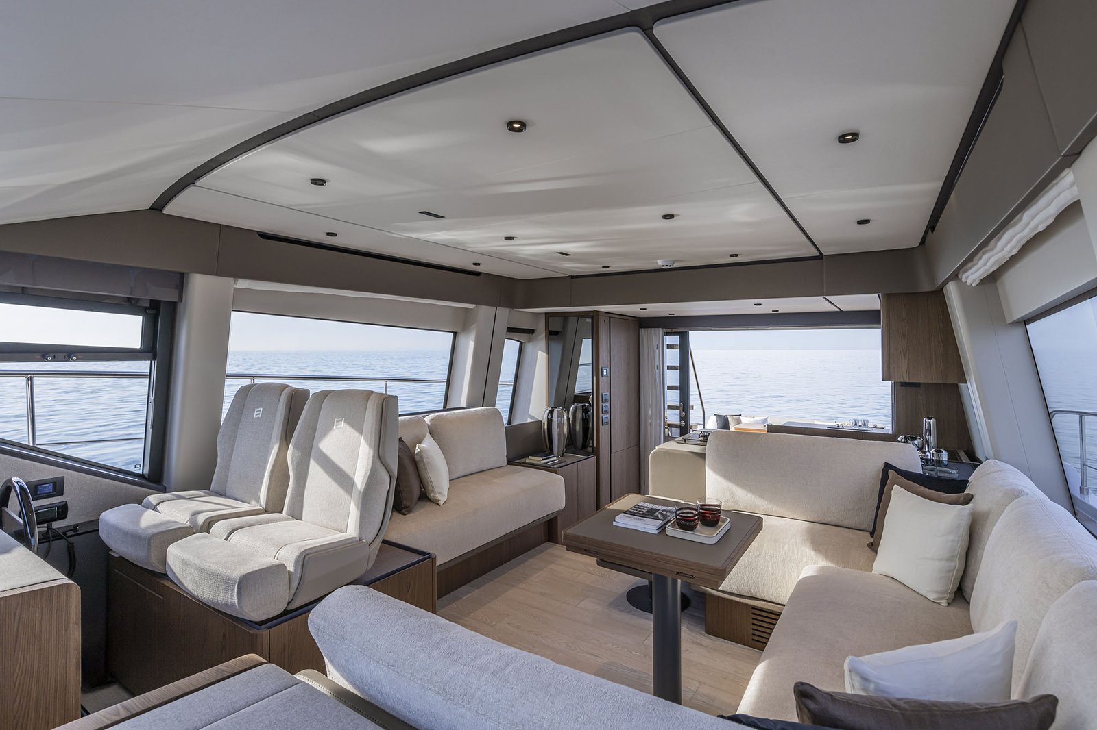 Inside, the layout includes three luxurious cabins, accommodating up to six guests overnight, with additional space for a crew member. The main deck is designed for socializing and relaxation, featuring a well-equipped galley, a comfortable salon with large windows for natural light, and a dining area that seamlessly connects to the outdoor spaces. With an impressive fuel capacity, the Ferretti Yachts 580 promises extended range and autonomy, perfect for long voyages.