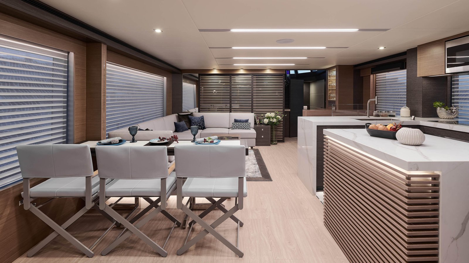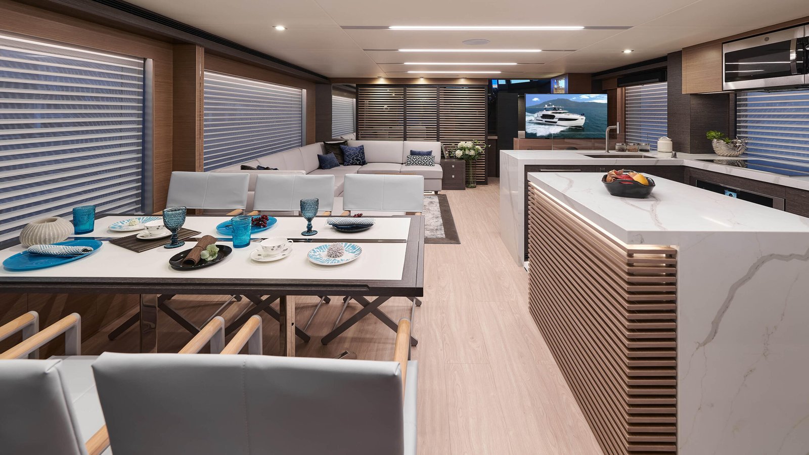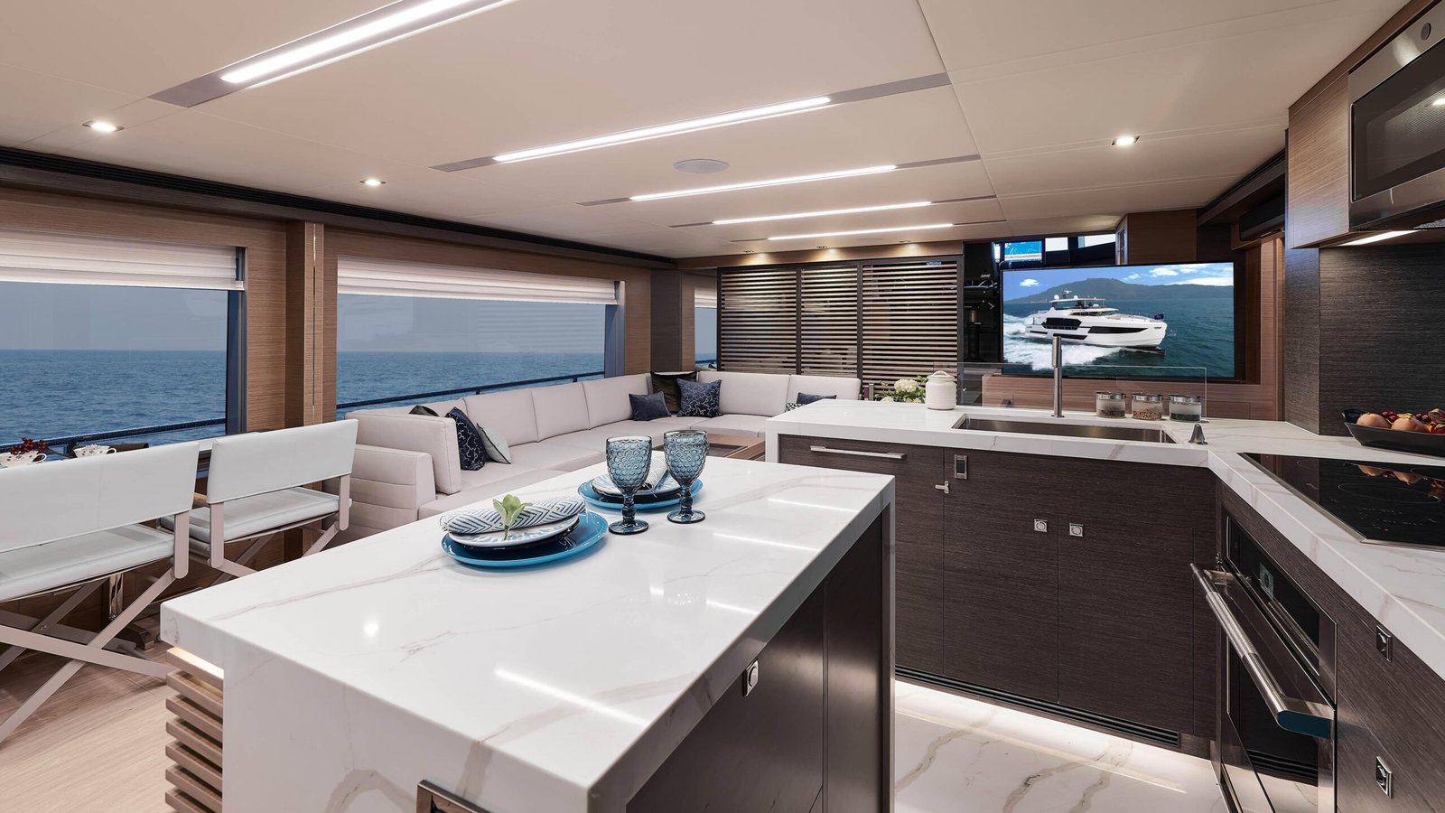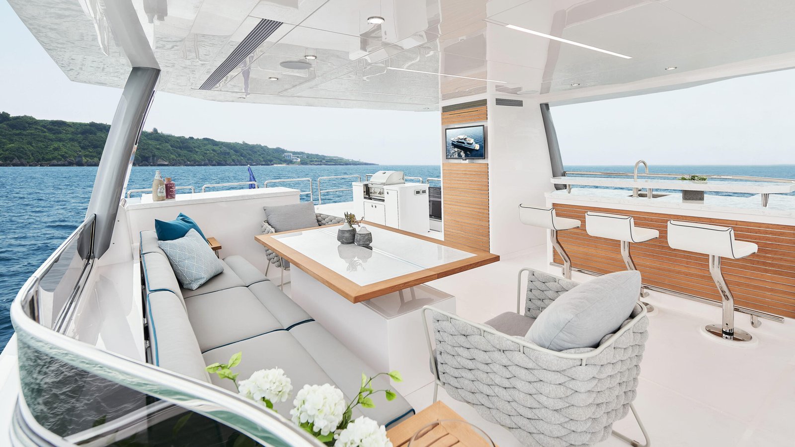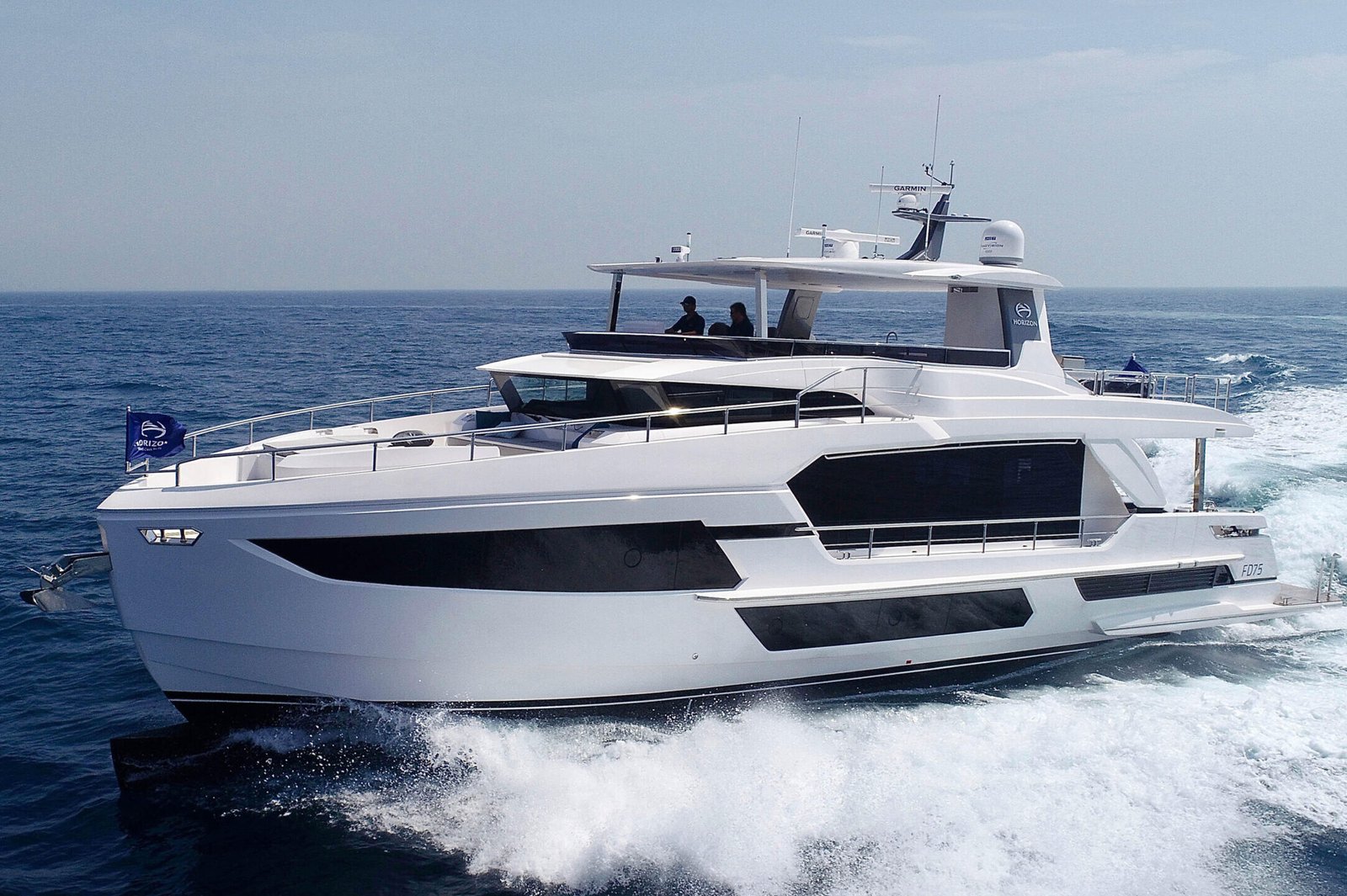 The Horizon Yachts FD75 is a luxury yacht that perfectly marries innovation with elegance, offering a refined cruising experience. With a length of 22.86 meters (approximately 75 feet), this yacht is designed to provide ample space and superior comfort for those who appreciate the finer things in life. The exterior design, conceptualized by the renowned Cor D. Rover, features a sleek, modern profile that stands out on any waterway. The FD75 is crafted with a GRP hull, ensuring durability and stability while maintaining a lightweight structure. Powered by twin Caterpillar C18 ACERT engines, this yacht achieves a cruising speed of 16 knots and can reach a maximum speed of 20 knots, offering both efficiency and power for long-distance voyages. Inside, the yacht is designed by Horizon’s in-house team, providing a luxurious and sophisticated atmosphere. The interior boasts high-end materials, attention to detail, and a spacious layout that accommodates up to 8 guests comfortably in 4 well-appointed cabins. The main deck is designed for socializing, featuring an open-plan salon and dining area that seamlessly connects to the outdoor spaces. The flybridge is another highlight, providing panoramic views and a perfect spot for relaxation or entertaining guests. The FD75 has a fuel capacity of 9,085 liters, giving it an impressive range for extended cruising adventures. With every detail meticulously crafted, the Horizon FD75 represents a pinnacle of luxury and performance in the yachting world.