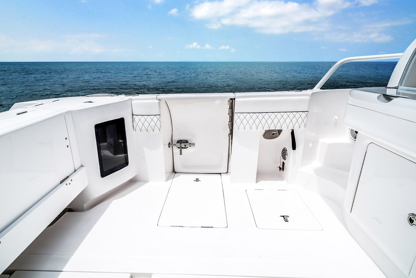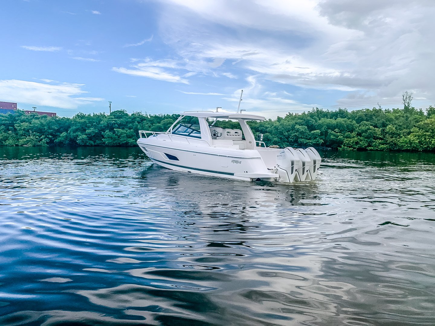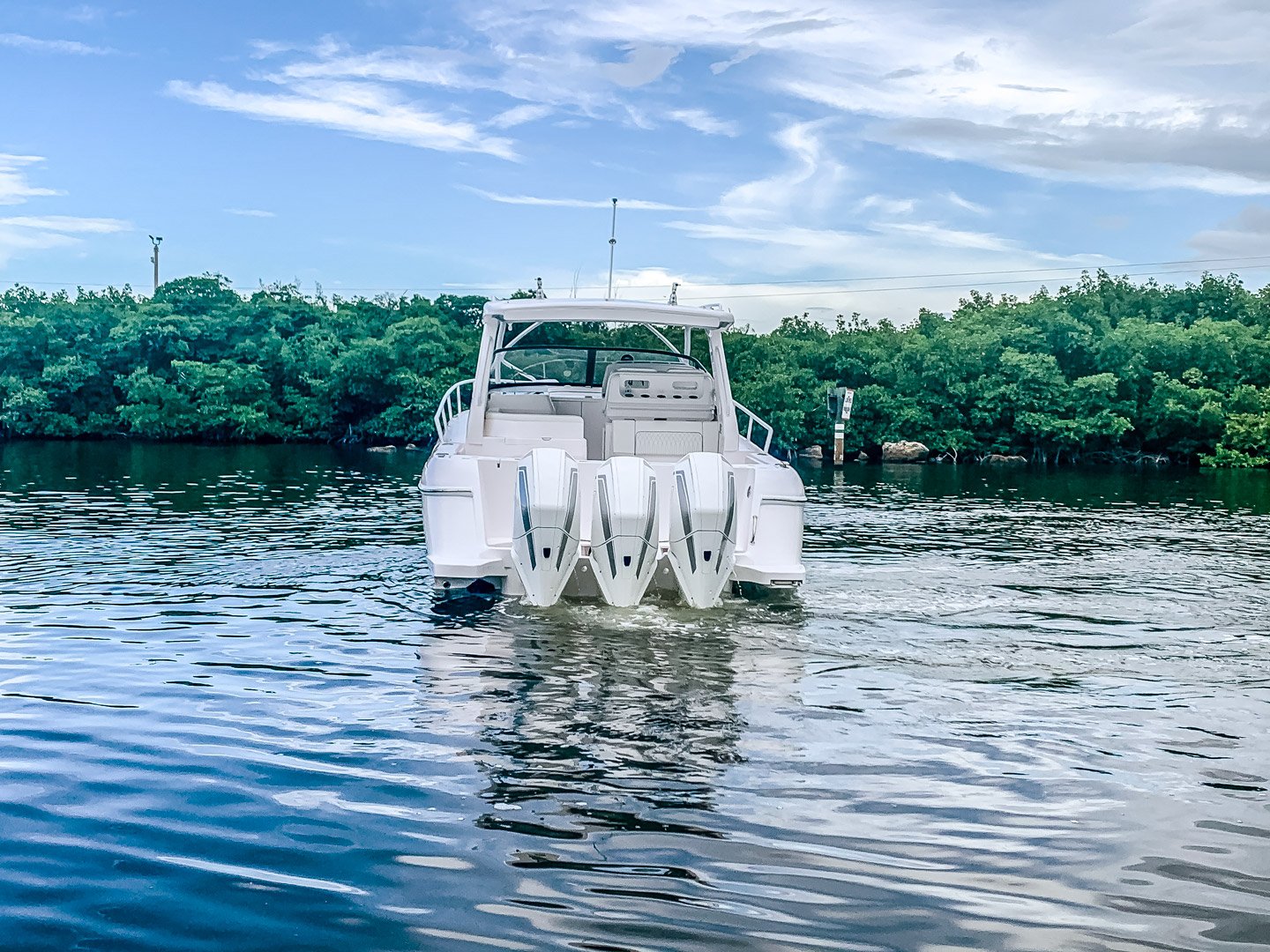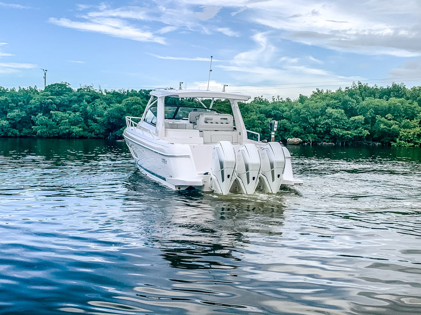 Powered by inboard engines, the Intrepid 438 Evolution offers a cruising speed of 30 knots and can reach a maximum speed of 40 knots, delivering both efficiency and thrill. Its range is strategically optimized for extended adventures, ensuring you can explore more without frequent refueling stops. The yacht features a spacious beam of 4.14 meters (13.6 feet) and a draft of 0.86 meters (2.82 feet), allowing for easy navigation through various water depths.