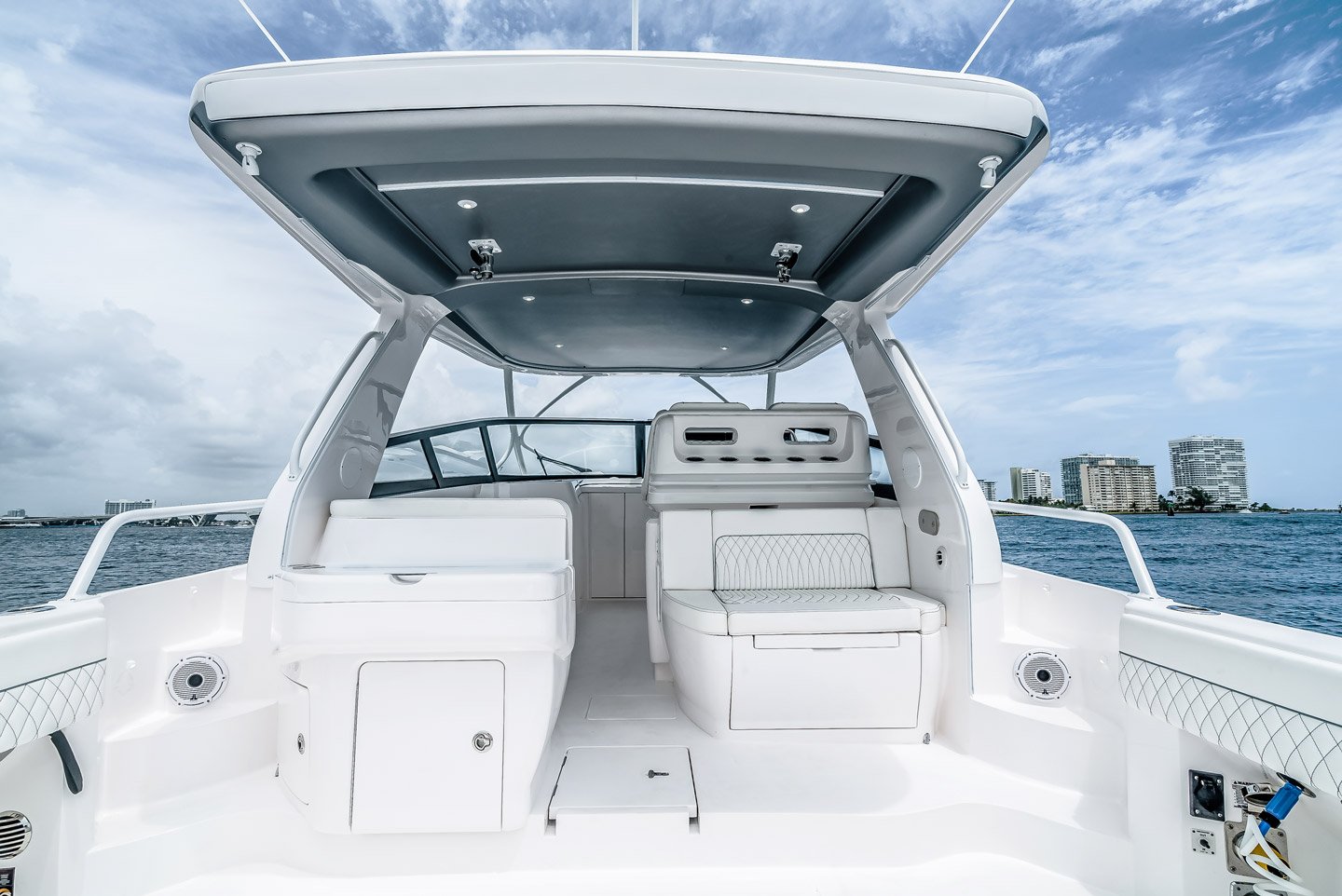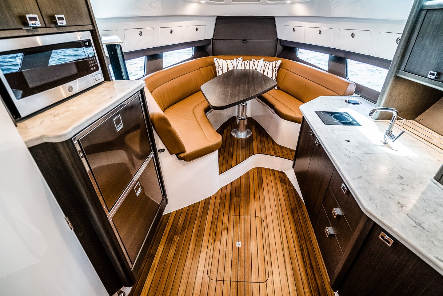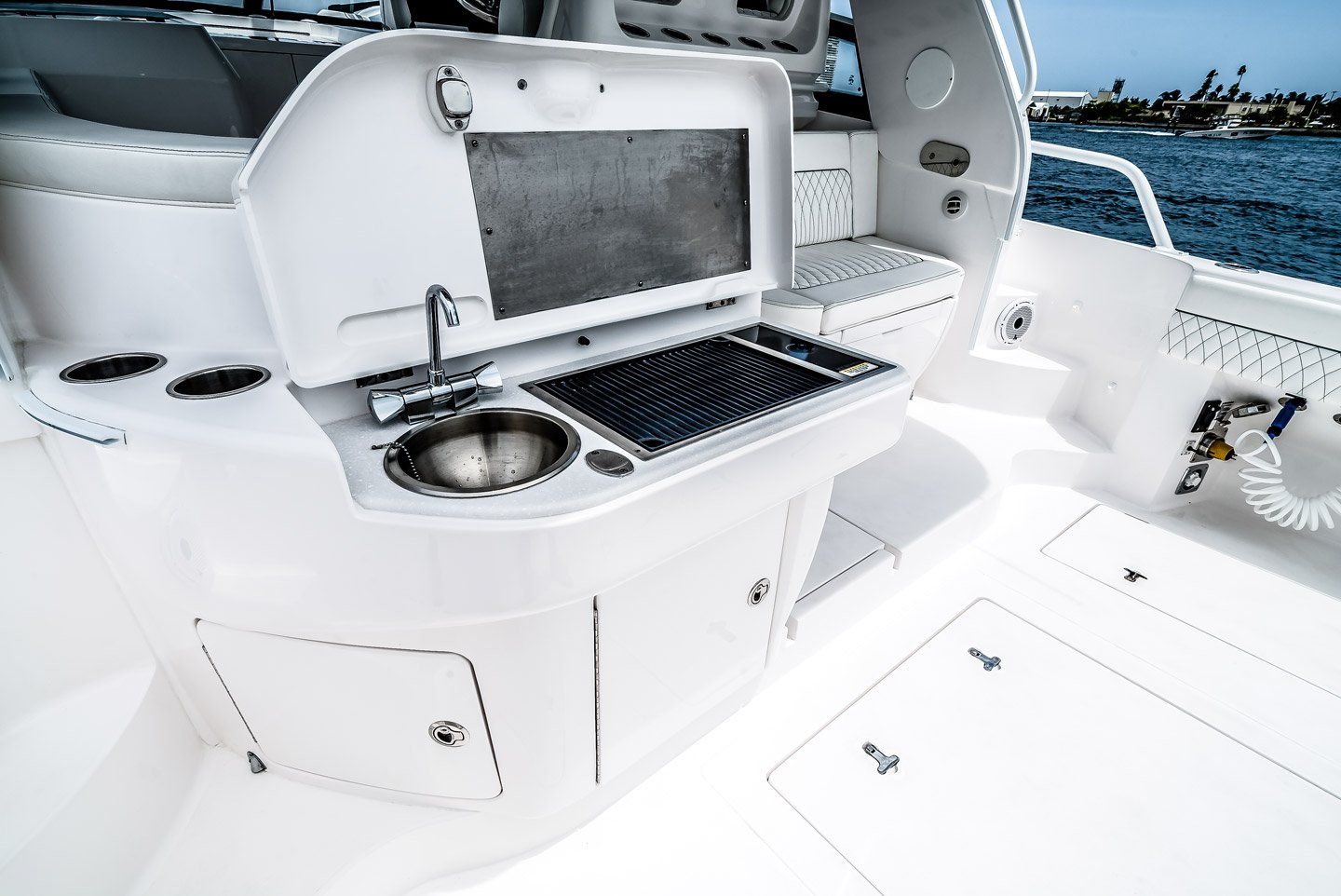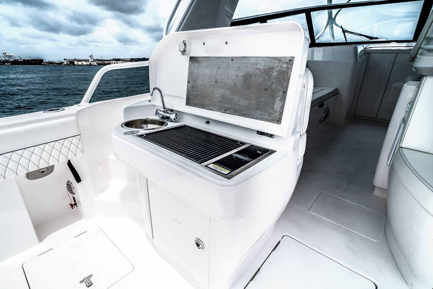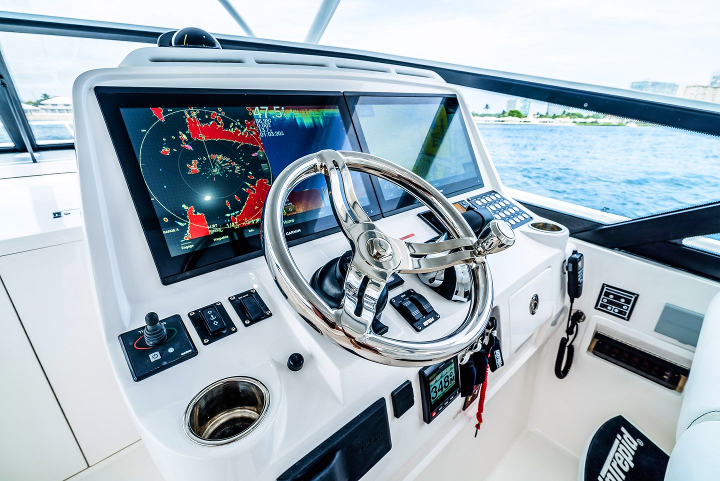 Powered by inboard engines, the Intrepid 438 Evolution offers a cruising speed of 30 knots and can reach a maximum speed of 40 knots, delivering both efficiency and thrill. Its range is strategically optimized for extended adventures, ensuring you can explore more without frequent refueling stops. The yacht features a spacious beam of 4.14 meters (13.6 feet) and a draft of 0.86 meters (2.82 feet), allowing for easy navigation through various water depths.