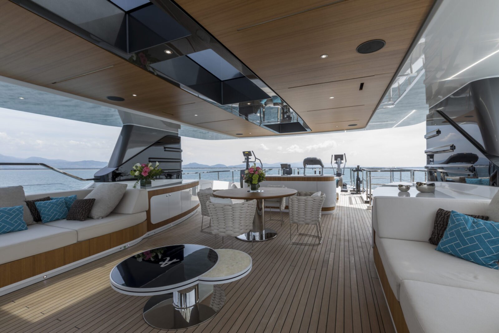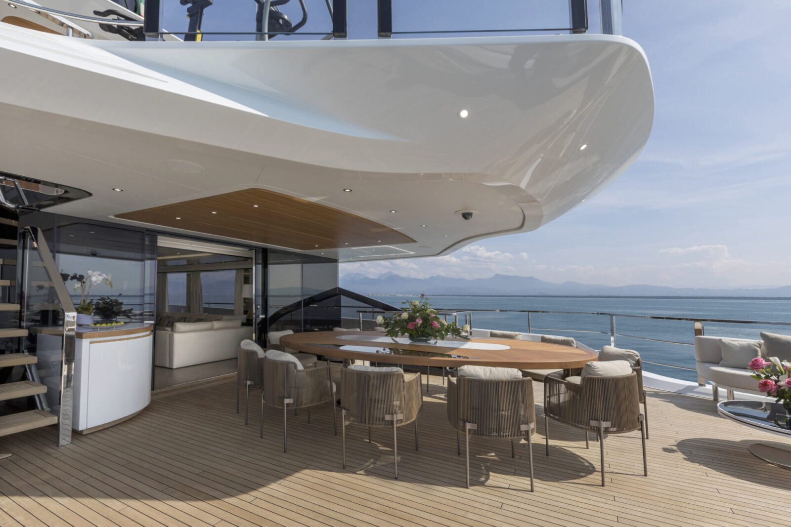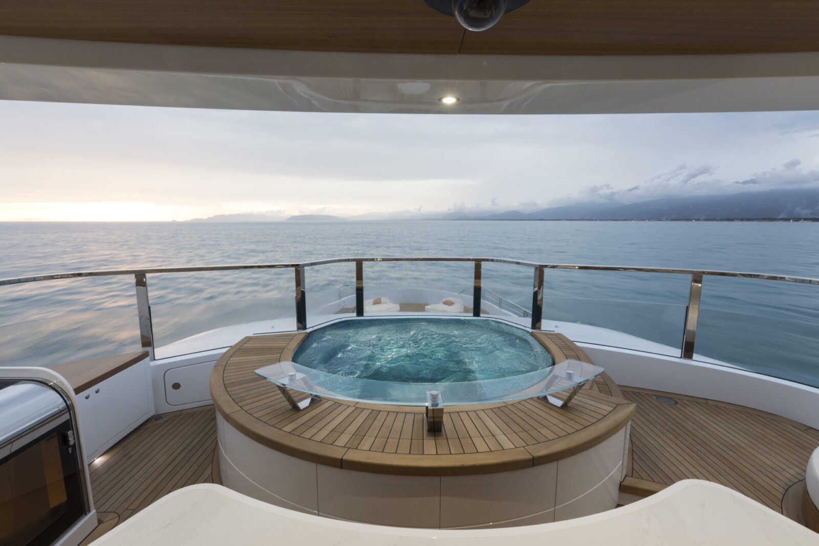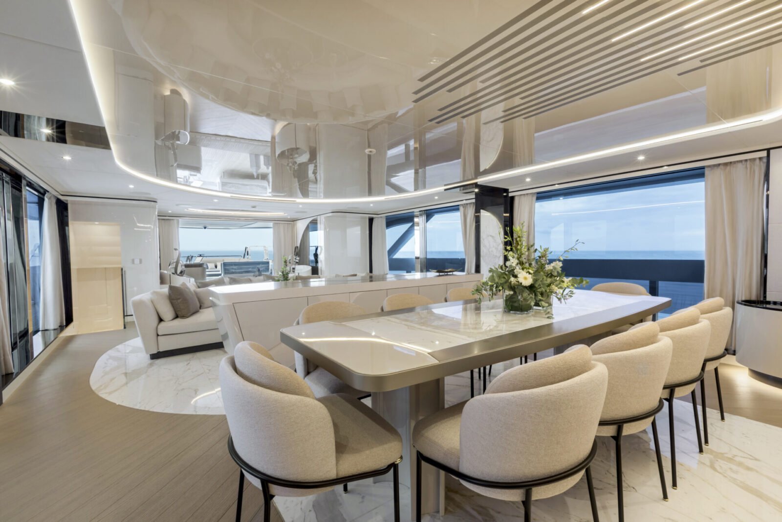 Accommodation on board is luxurious and spacious, with room for up to 12 guests across five lavish cabins, including a full-beam owner’s suite. The yacht also accommodates a crew of 11, ensuring a high level of service and attention to detail. The Oceano 50 offers an array of amenities, such as a beach club, a jacuzzi, and multiple dining and lounging areas, providing a seamless blend of indoor and outdoor living. This yacht is not just a means of transport, but a statement of elegance and sophistication, setting a new standard in the luxury yachting industry.
