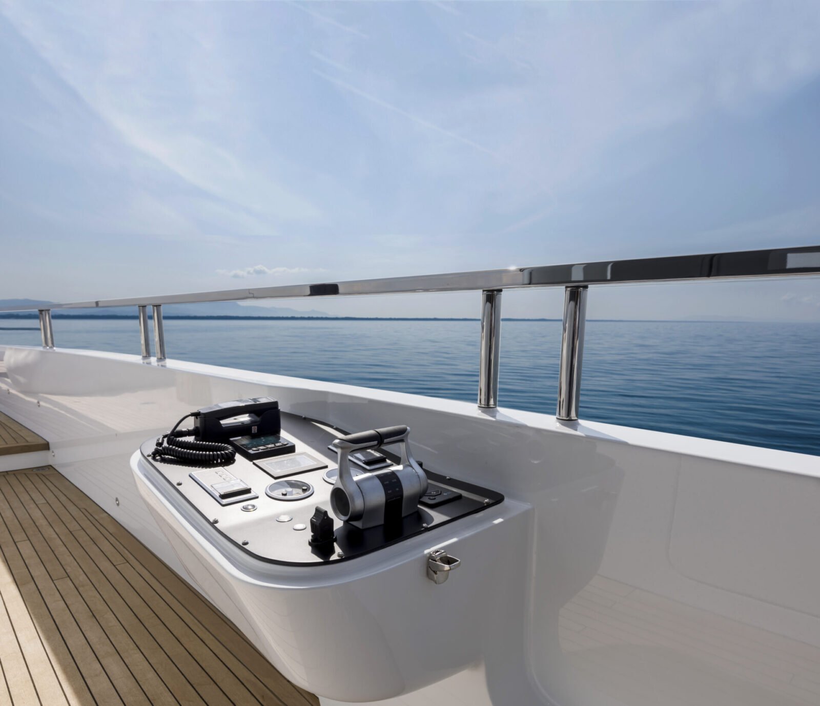 Under the hood, the Oceano 50 is powered by twin MTU 12V 2000 M86 engines, delivering a cruising speed of 11 knots and a maximum speed of 16 knots, ensuring smooth and efficient voyages. The yacht’s steel hull and aluminum superstructure ensure robust stability and durability, perfect for long-distance cruising. With a fuel capacity of 68,000 liters, the Oceano 50 has an impressive range of 4,500 nautical miles, making it ideal for extensive journeys across the sea.