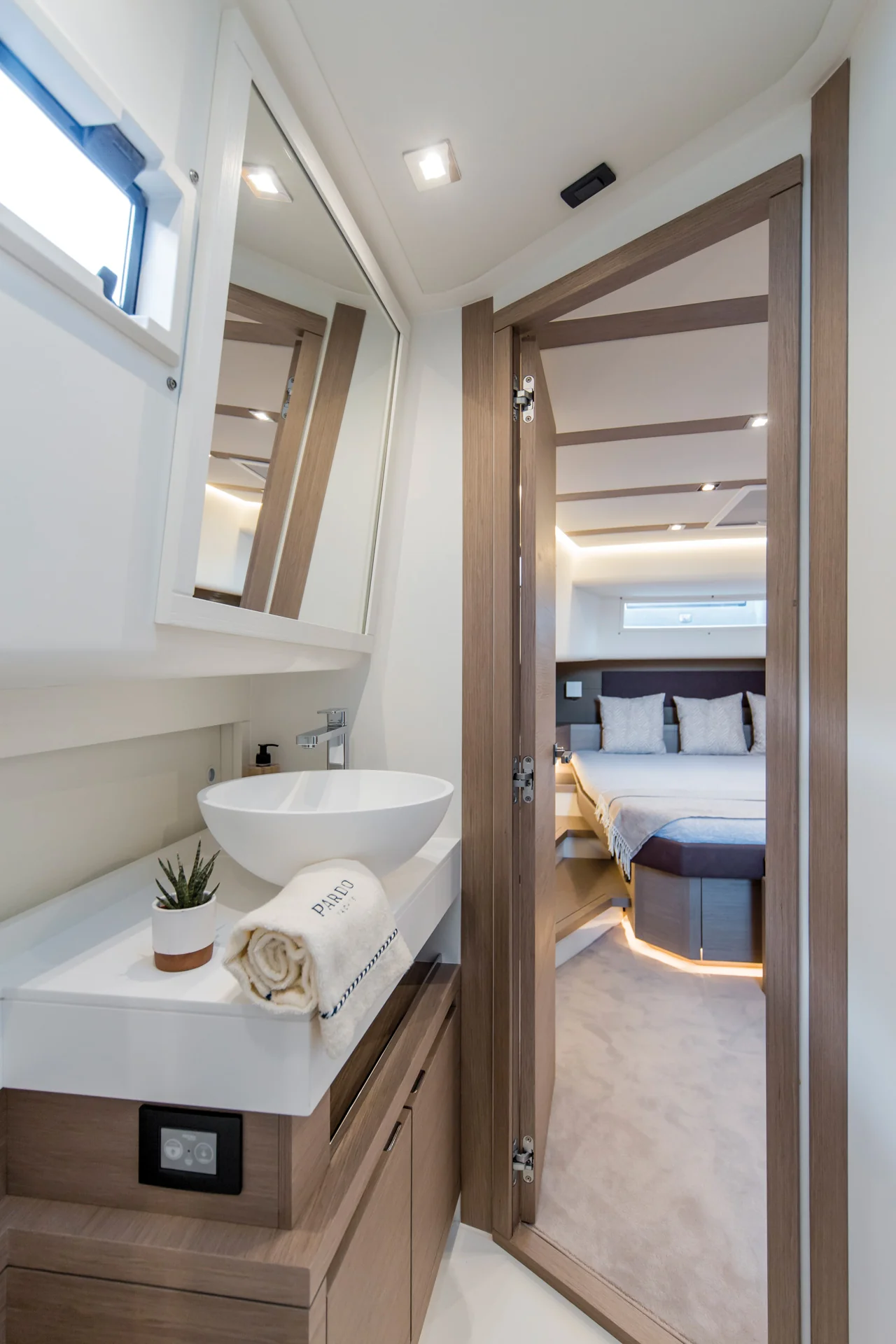 Inside, the Pardo 50 boasts a luxurious interior designed by the in-house team at Pardo, crafted to ensure comfort and sophistication. The yacht can accommodate up to 8 day guests and sleep 4 in two spacious cabins, making it perfect for family trips or social gatherings. The well-appointed galley and elegant saloon are designed for convenience and relaxation.