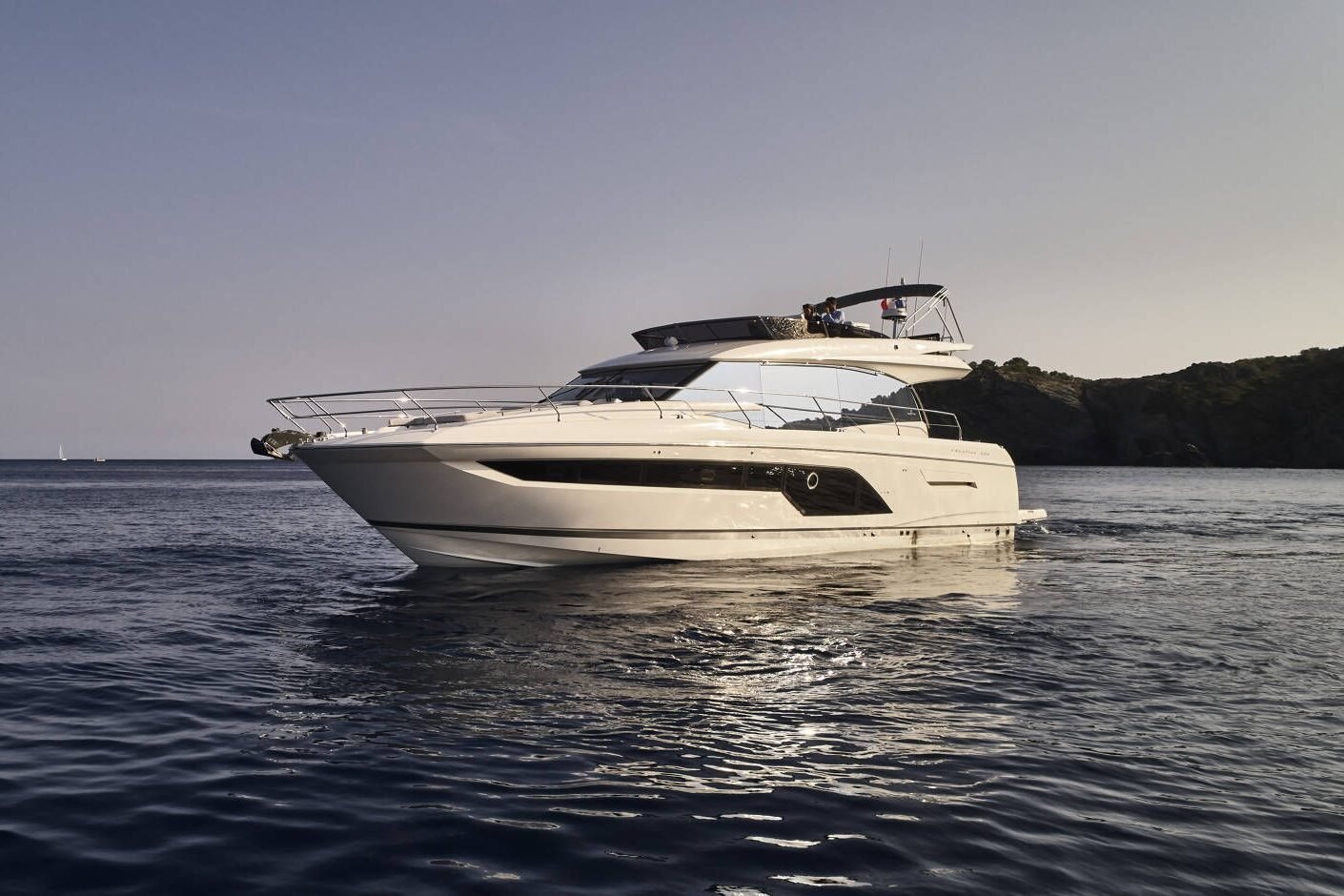 The Prestige 590 embodies the essence of luxury yachting through its innovative design and superior comfort. Measuring 18.7 meters in length, this motor yacht features an elegant and sleek exterior crafted by renowned designer Garroni Design, ensuring both aesthetic appeal and functional excellence. The interior, designed by Prestige’s in-house team, offers a harmonious blend of comfort and style, featuring high-end materials and meticulous attention to detail. The yacht’s layout includes three spacious cabins, accommodating up to six guests, along with separate quarters for crew, ensuring privacy and convenience. Powered by Volvo IPS 950 engines, the Prestige 590 boasts a cruising speed of 23 knots and a maximum speed of 29 knots, making it perfect for both leisurely cruises and exhilarating adventures. Its planning hull configuration ensures smooth and efficient navigation, while a generous fuel capacity of 2,200 liters provides an impressive range for exploring distant shores. The flybridge offers an expansive outdoor living space with a sunpad, dining area, and wet bar, ideal for entertaining guests or relaxing in the sun. Advanced navigation and control systems ensure ease of maneuverability, even for less experienced yacht enthusiasts. With a focus on luxury, performance, and modern technology, the Prestige 590 stands out as a premier choice in the motor yacht category, promising unforgettable journeys on the open sea.