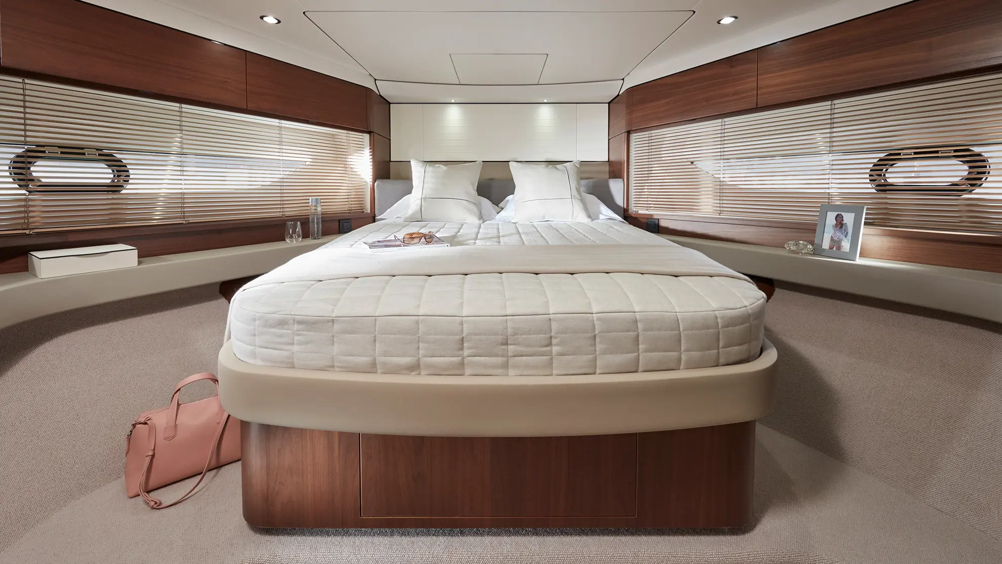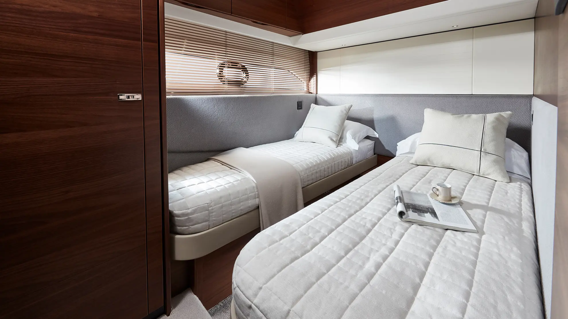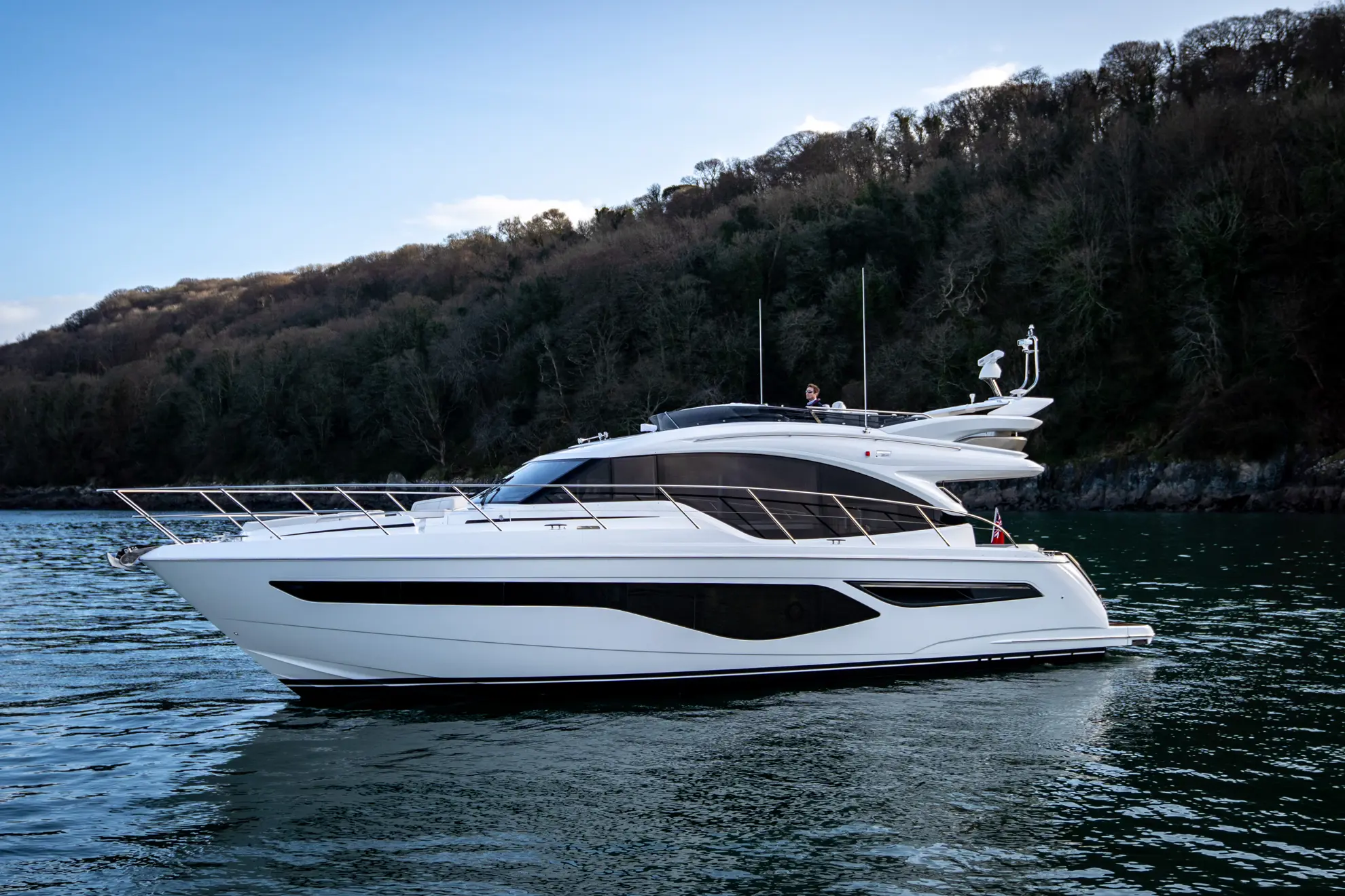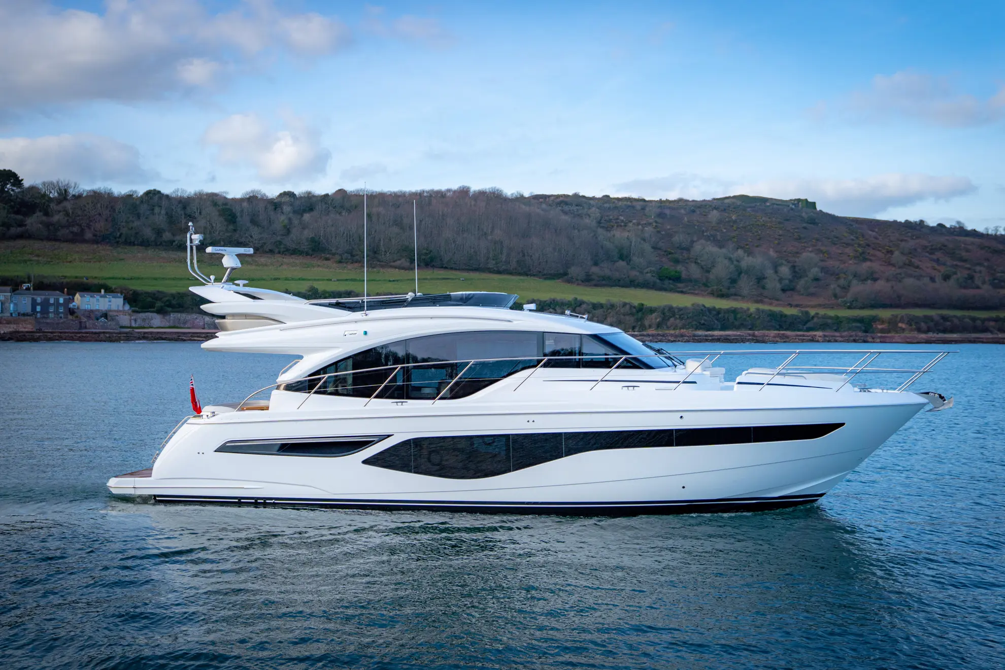 The Princess F55 is a stunning embodiment of luxury and performance, meticulously crafted by Princess Yachts to deliver an unparalleled cruising experience. With a length of 17.6 meters, the F55 is designed to offer a harmonious blend of style, comfort, and functionality. Its sleek profile and sophisticated lines are complemented by a spacious flybridge, providing an exceptional vantage point for enjoying the open sea. The yacht is powered by twin Volvo D13-800 engines, ensuring a smooth and powerful ride, with a cruising speed of 24 knots and a maximum speed of 33 knots. Inside, the F55 boasts a beautifully appointed interior, featuring the finest materials and craftsmanship. The main deck offers an expansive saloon with panoramic windows, a fully equipped galley, and a dining area that seamlessly extends to the cockpit. Below deck, the accommodation comprises three luxurious cabins, including a full-beam master suite, a forward guest cabin, and a twin cabin, providing comfortable sleeping arrangements for up to six guests. With a displacement of 24,600 kg, the F55 is built with a GRP hull and a planning configuration, ensuring stability and superior handling. The yacht’s fuel capacity of 2,750 liters allows for extended voyages, while the water capacity of 608 liters ensures ample supply for onboard amenities. Designed by the talented in-house team at Princess Yachts, the F55 is a masterpiece of naval architecture, engineering, and interior design. Whether cruising along coastal waters or embarking on offshore adventures, the Princess F55 promises an unforgettable yachting experience.