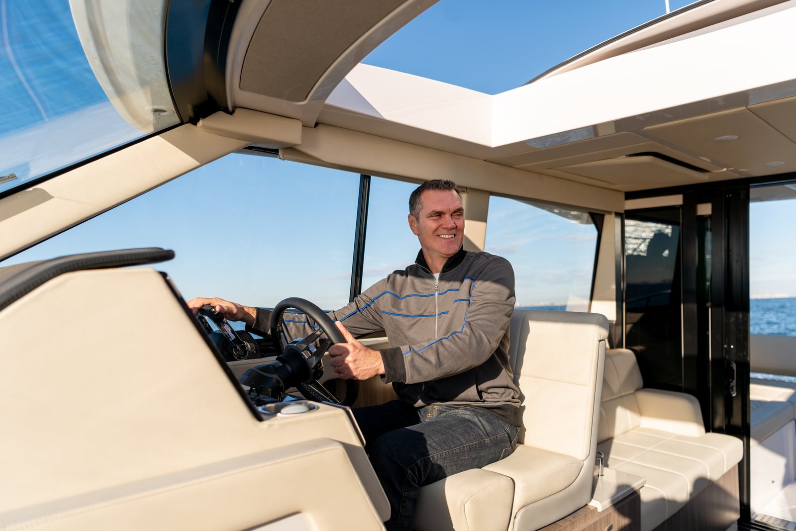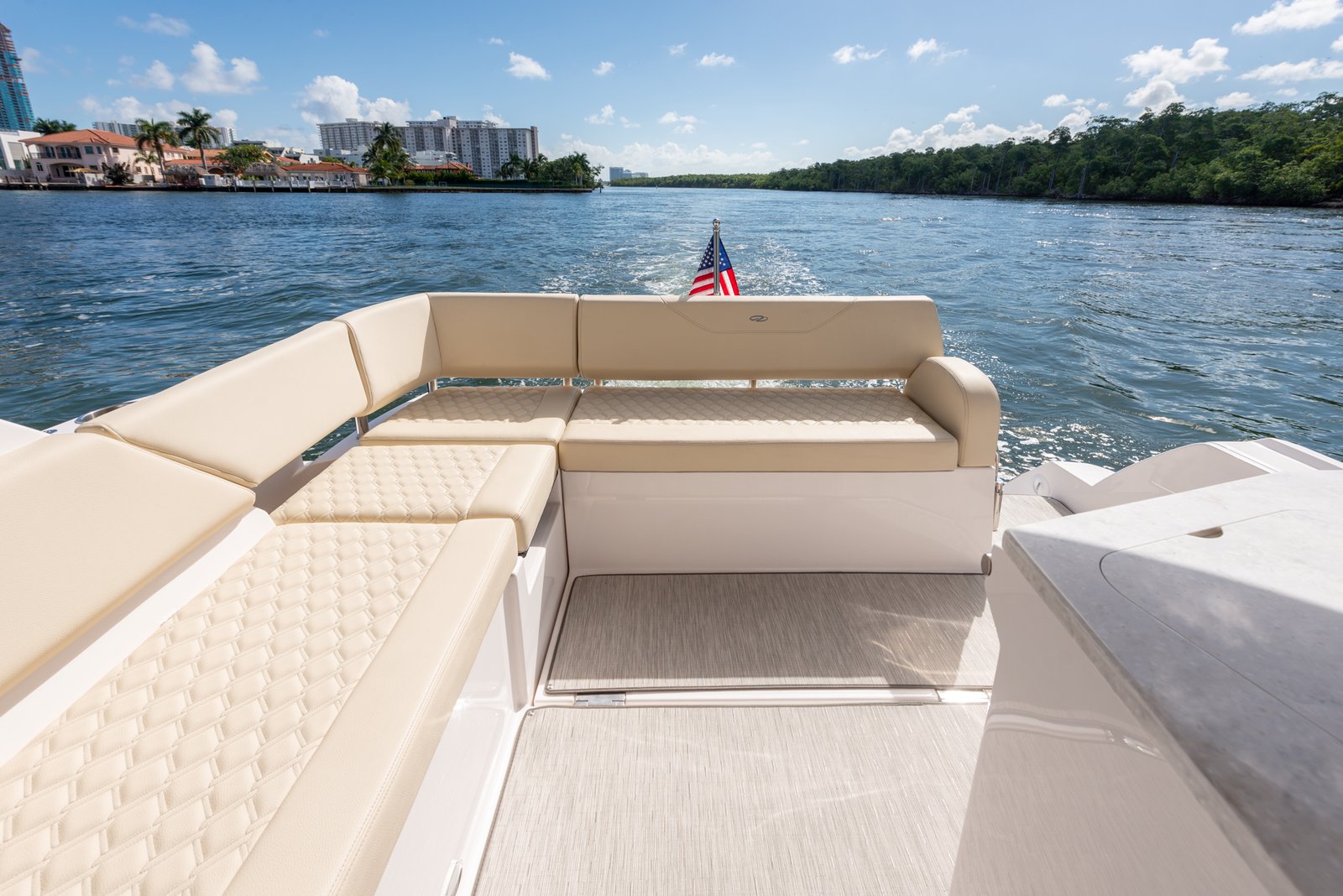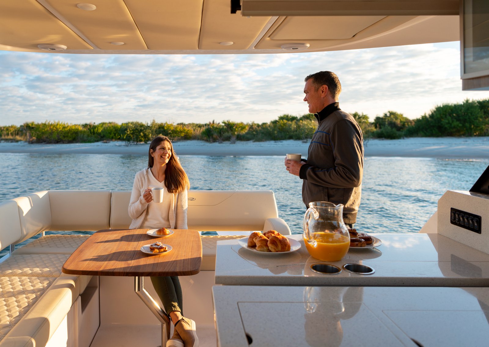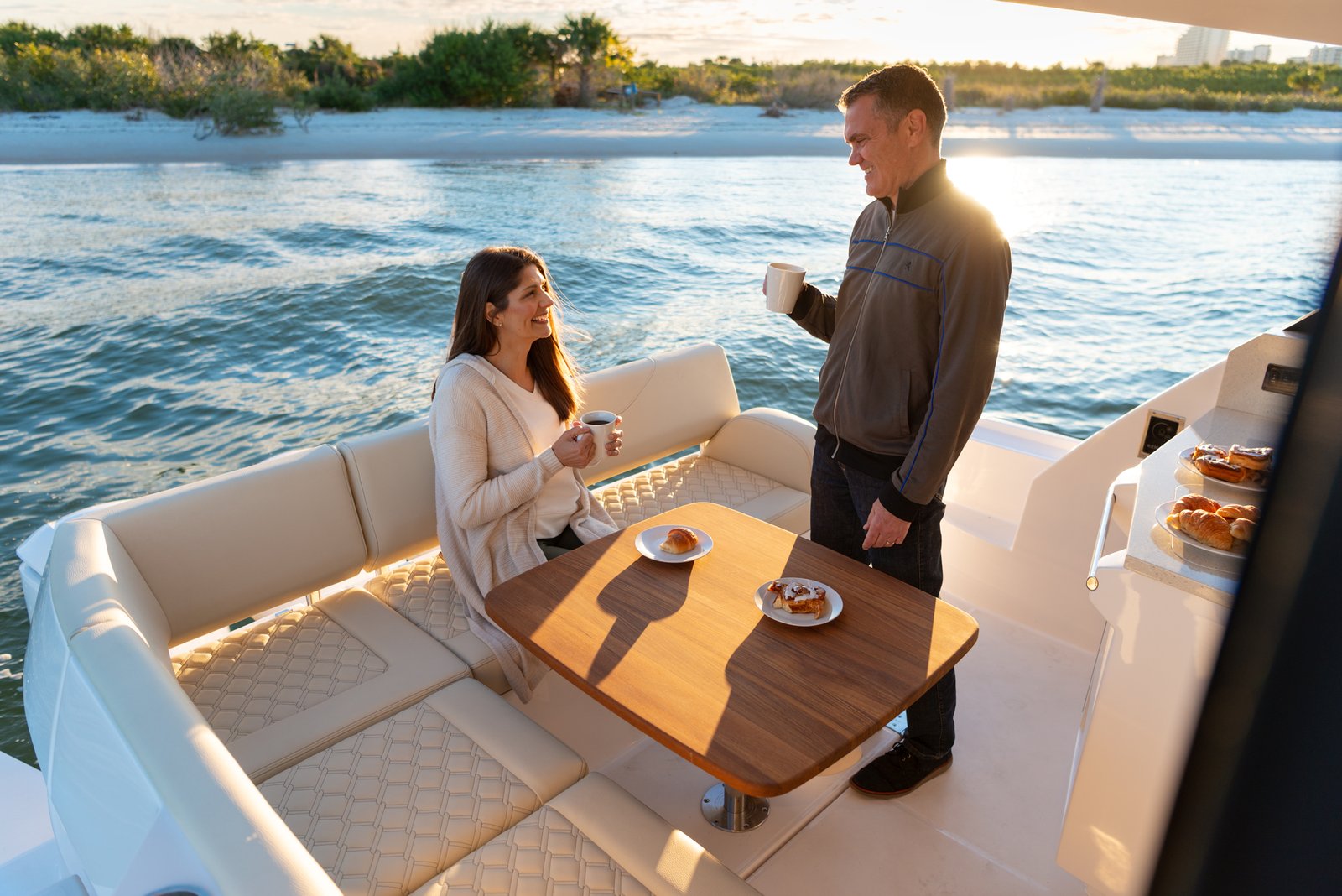 Equipped with twin Yamaha 300HP outboard engines as standard, the Regal 38 XO offers impressive performance, reaching cruising speeds of 26 knots and a maximum speed of up to 40 knots, allowing for exhilarating journeys on the water. The thoughtful engineering and design by Regal’s in-house team ensure optimal performance and handling in various sea conditions. The interior is elegantly designed with premium materials, offering both functionality and luxury with features such as a fully-equipped galley, a comfortable salon area, and a private head.