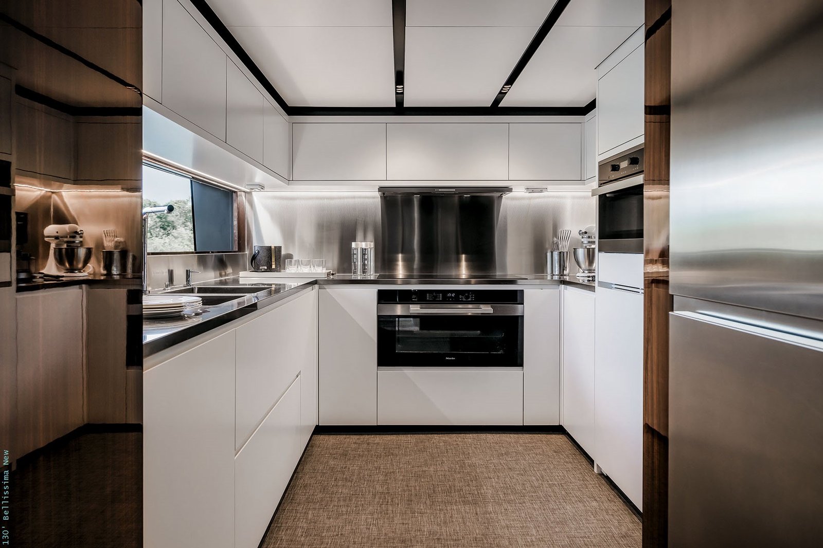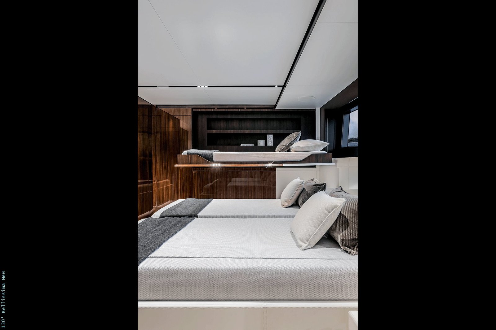 Inside, the 130 Bellissima can accommodate up to 10 guests across five beautifully appointed cabins, each designed to provide the ultimate in comfort and privacy. The yacht also includes quarters for a crew of seven, ensuring a high level of service and hospitality. With a beam of 8 meters, the spaciousness of the interior is enhanced, providing ample room for relaxation and entertainment.