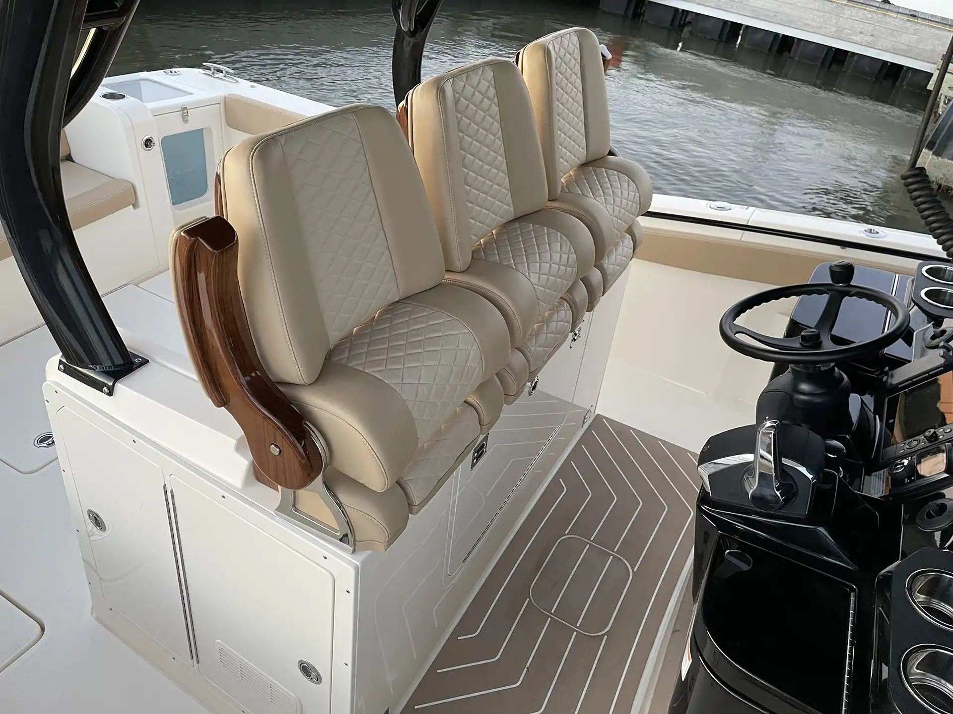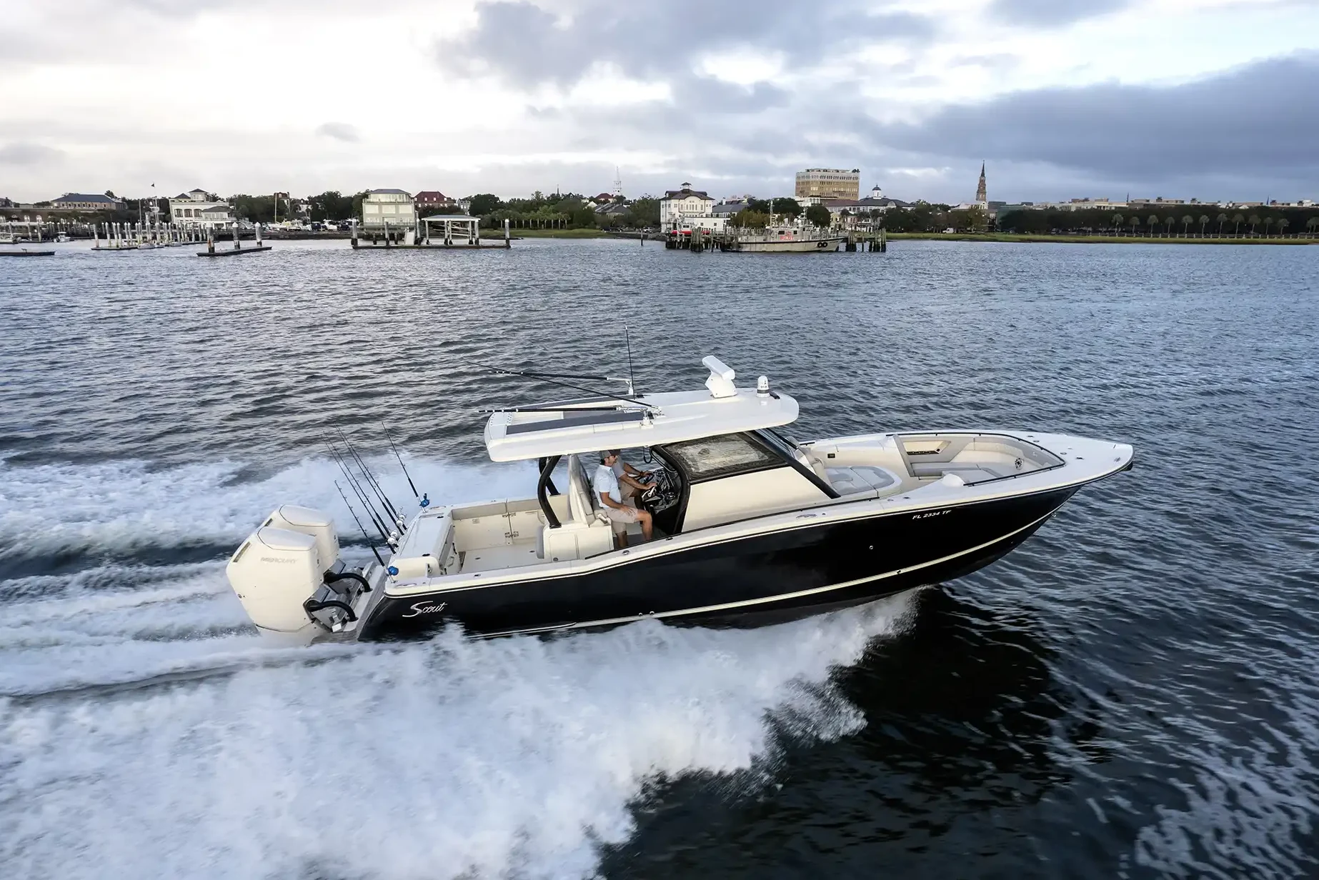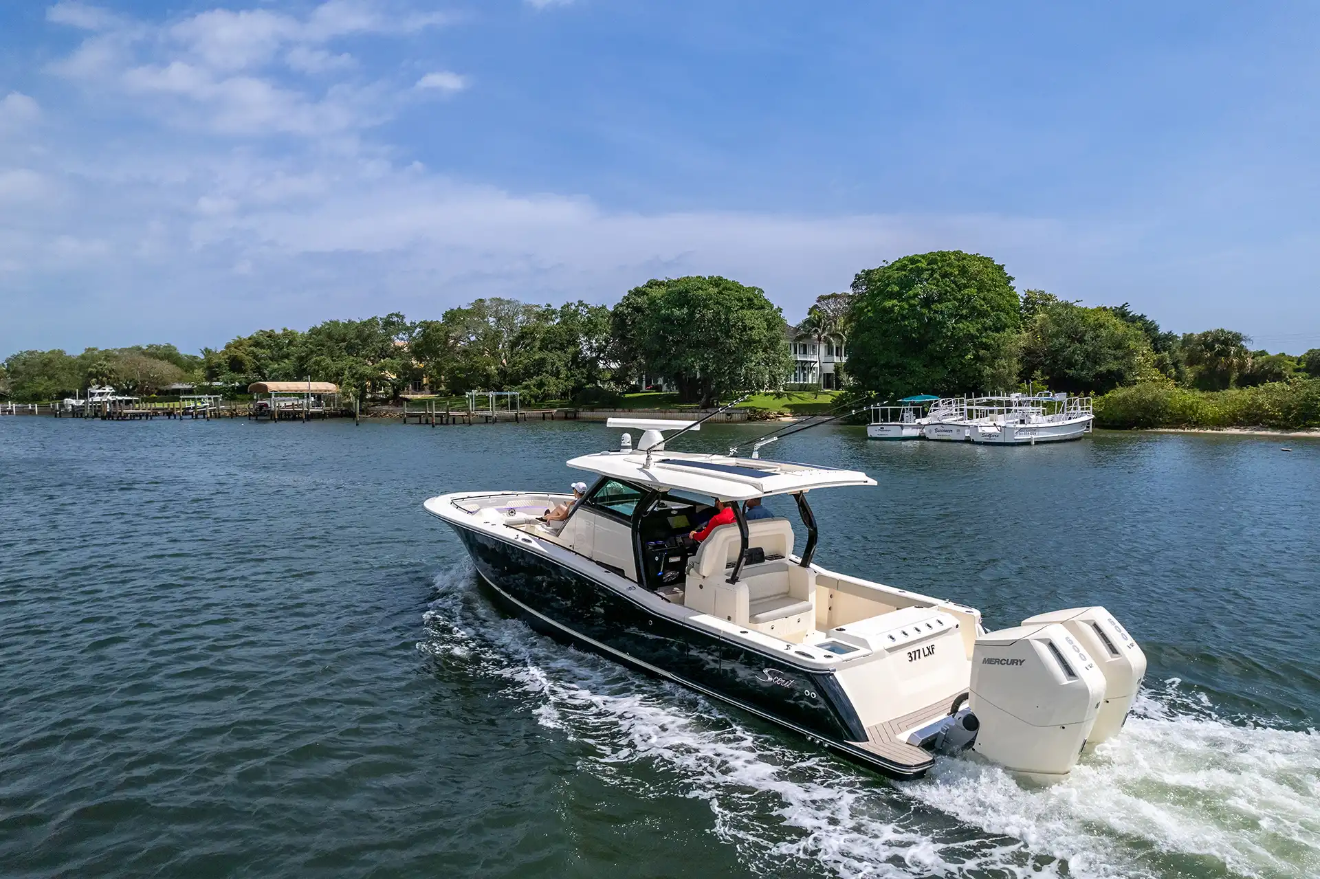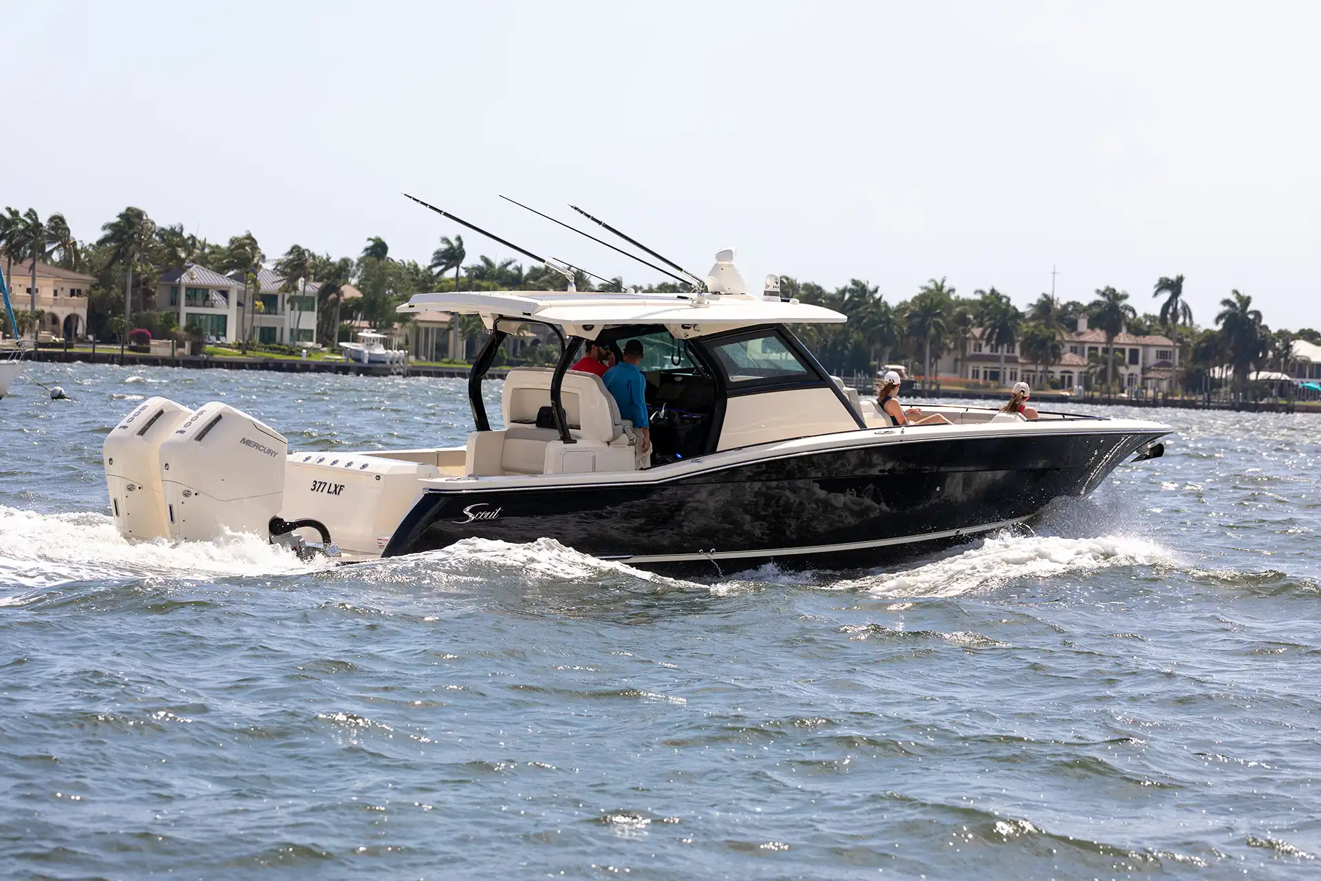 The Scout 377 LXF is a premium center console boat crafted with precision and designed to deliver an unrivaled experience on the water. This model is known for its sophisticated design and innovative features, making it a top choice for boating enthusiasts seeking both luxury and performance. Constructed with high-quality GRP, the hull design ensures stability and efficiency, while the sleek monohull configuration enhances speed and maneuverability. Powered by triple outboard engines, the 377 LXF offers impressive speed capabilities, effortlessly reaching a maximum speed of around 60 knots. A comfortable cruising speed of 30 knots ensures a smooth ride, whether you’re heading out for a day of fishing or a leisurely cruise along the coast. With a spacious layout, the 377 LXF can comfortably accommodate up to 12 guests during the day, making it perfect for entertaining family and friends or hosting a small gathering on the water. The advanced helm station is equipped with state-of-the-art navigation and control systems, providing the captain with everything needed for a seamless voyage. The interior boasts refined finishes and ample seating, ensuring that every guest enjoys their time aboard. The Scout 377 LXF is more than just a boat; it’s a statement of style and capability, embodying the Scout brand’s commitment to excellence and innovation in marine design.