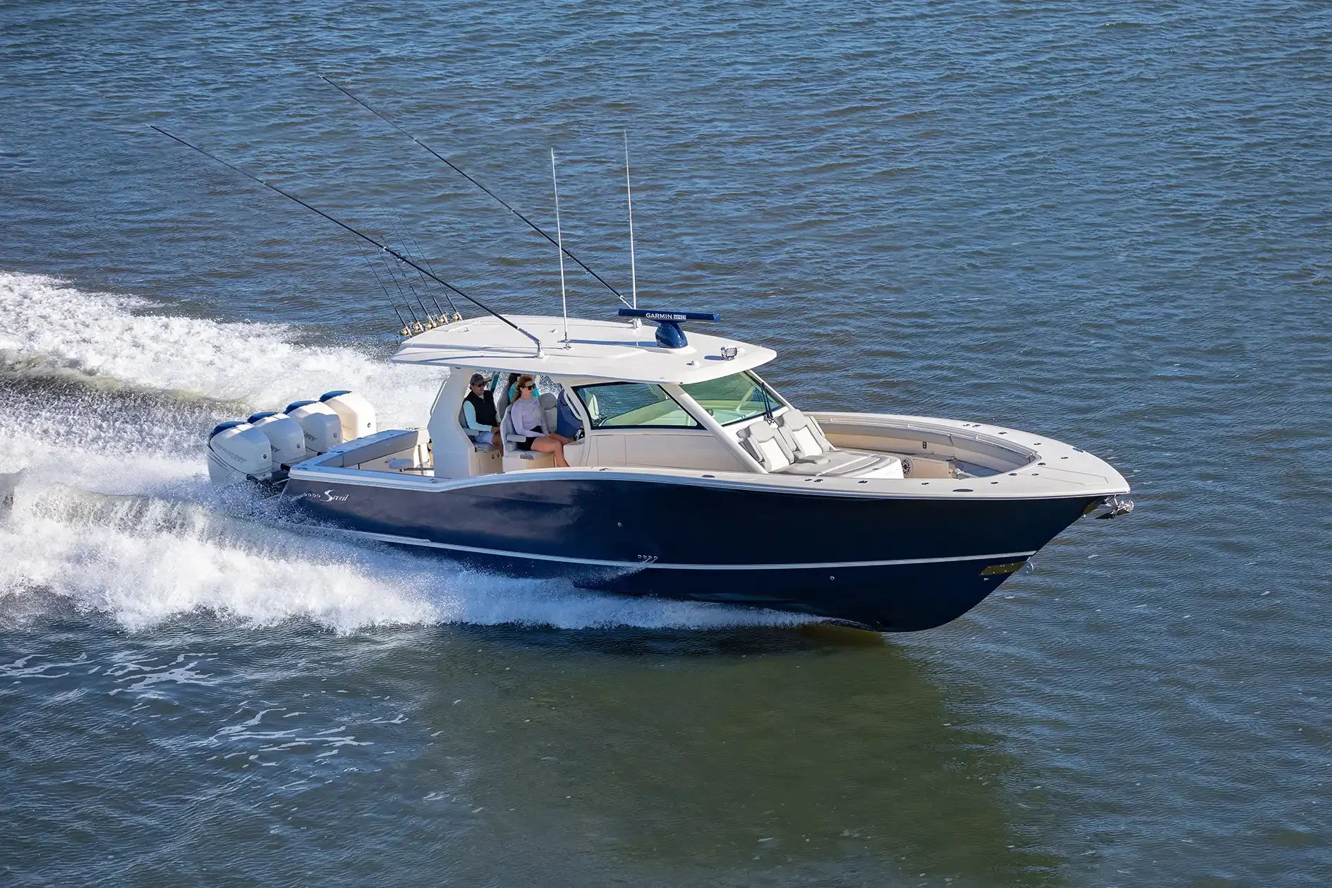 The Scout 425 LXF is a marvel of marine engineering, offering unparalleled luxury and performance for the discerning boat owner. With a length of 12.8 meters, this center console vessel is crafted from high-quality GRP, ensuring both durability and a sleek aesthetic. The design is the result of Scout’s in-house team, renowned for their innovative and stylish approach to boat building. The 425 LXF is powered by an impressive outboard engine setup, providing a cruising speed of 30 knots and a maximum speed of 55 knots, making it ideal for both leisurely cruises and exhilarating adventures. The vessel is equipped with a spacious beam of 3.99 meters, enhancing stability and providing ample room for onboard activities. Featuring a draft of 0.7 meters, the 425 LXF offers the perfect balance for shallow water access without compromising on open-water performance. The interior of the 425 LXF is a testament to luxury, with two well-appointed cabins that can accommodate up to four sleeping guests and provide a comfortable retreat after a day of exploration. The open deck layout is designed to host up to 12 day guests, making it perfect for entertaining. With a fuel capacity of 2050 liters, the 425 LXF ensures that you are well-equipped for long journeys. Priced at approximately 1,200,000 EUR for new models, this vessel represents a significant investment in quality and craftsmanship. Used models can range from 950,000 EUR to 1,050,000 EUR, depending on the condition and year of manufacture.
