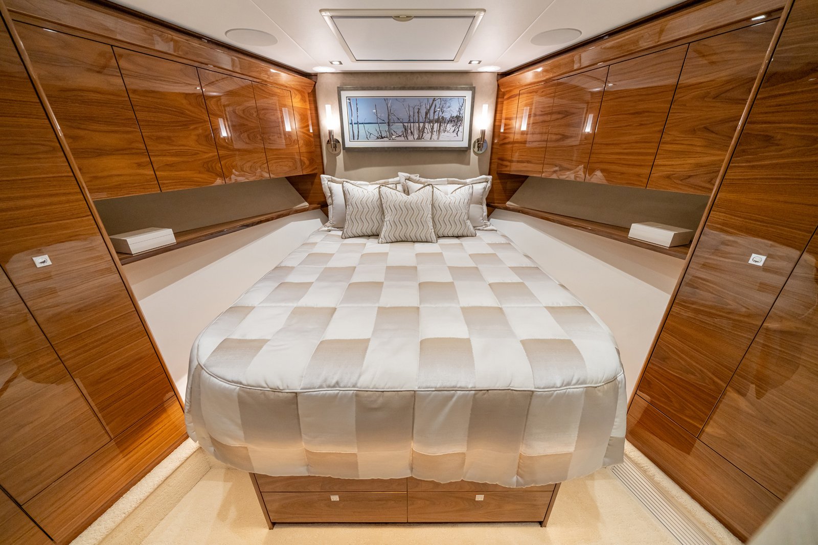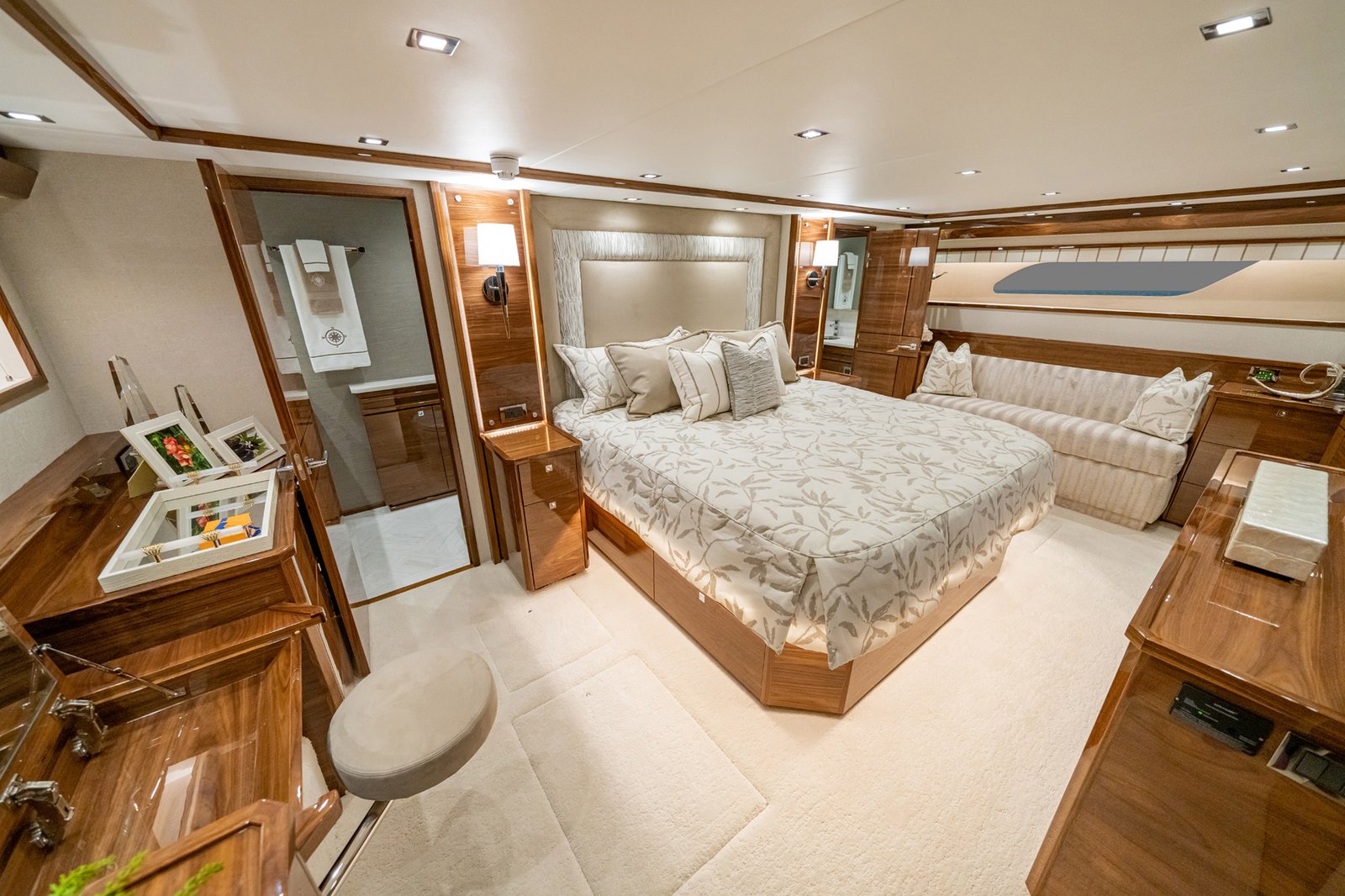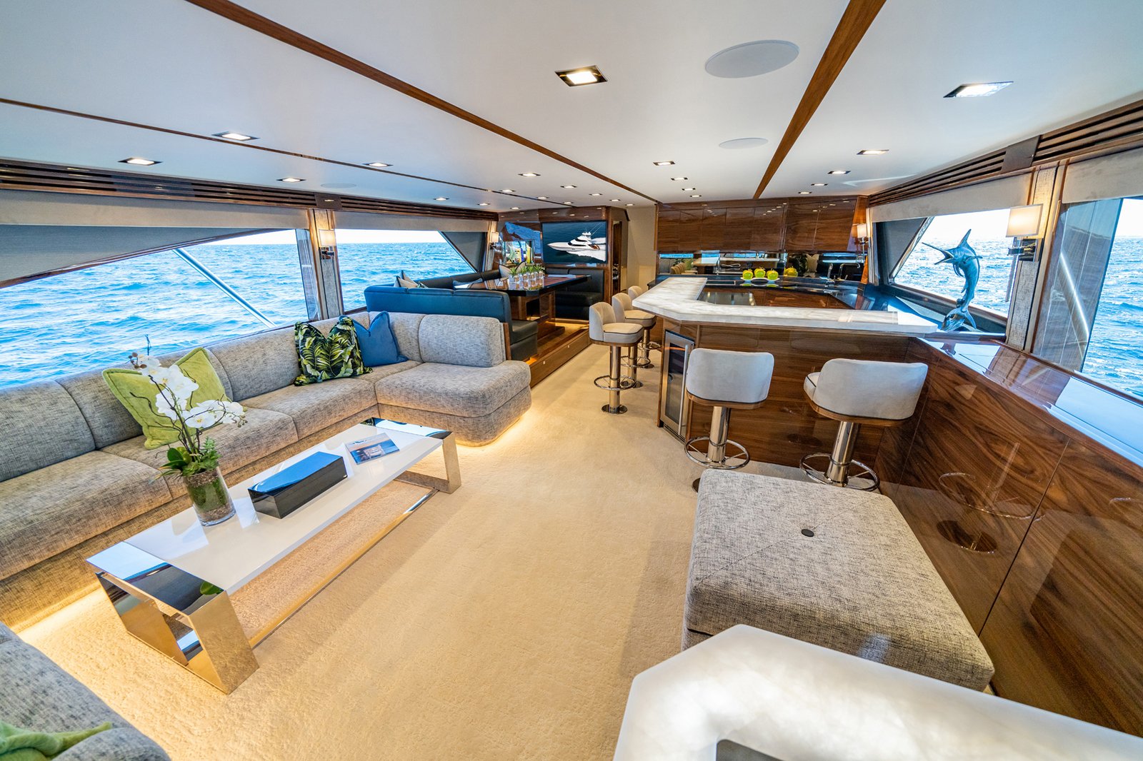 Inside, the Viking 90 Enclosed Bridge offers luxurious accommodations for up to 8 guests across 4 elegantly appointed cabins. The interior is a masterpiece of modern design, featuring materials and finishes that exude sophistication and comfort. The expansive salon provides a perfect setting for relaxation and entertainment, with large windows offering panoramic views of the surrounding seascape. The flybridge is another highlight, equipped with state-of-the-art navigational equipment and ample seating for enjoying the sea breeze.